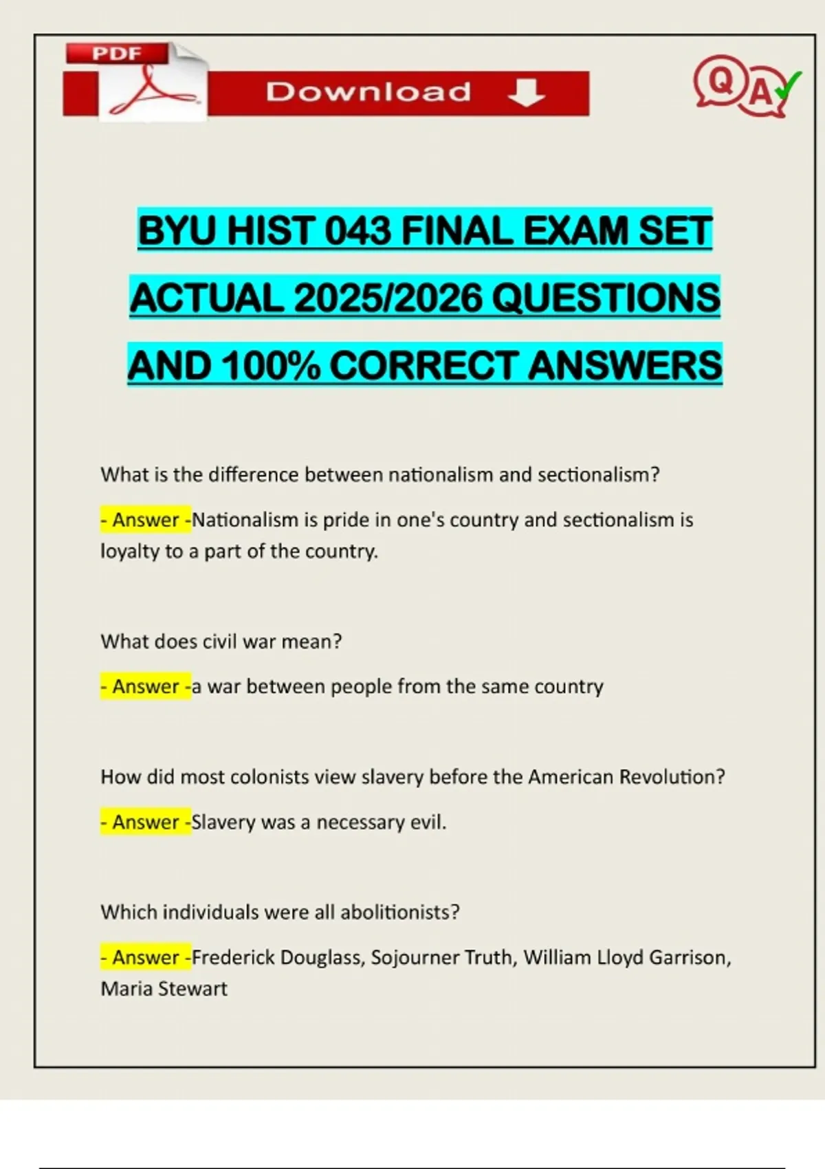 BYU HIST 043 FINAL EXAM SET ACTUAL 2025/2026 QUESTIONS AND 100% CORRECT ANSWERS What is the difference between nationalism and sectionalism? - Answer -Nationalism is pride in one's country and sectionalism is loyalty to a part of the country. What does civil war mean? - Answer -a war between people from the same country How did most colonists view slavery before the American Revolution? - Answer -Slavery was a necessary evil. Which individuals were all abolitionists? - Answer -Frederick Douglass, Sojourner Truth, William Lloyd Garrison, Maria Stewart