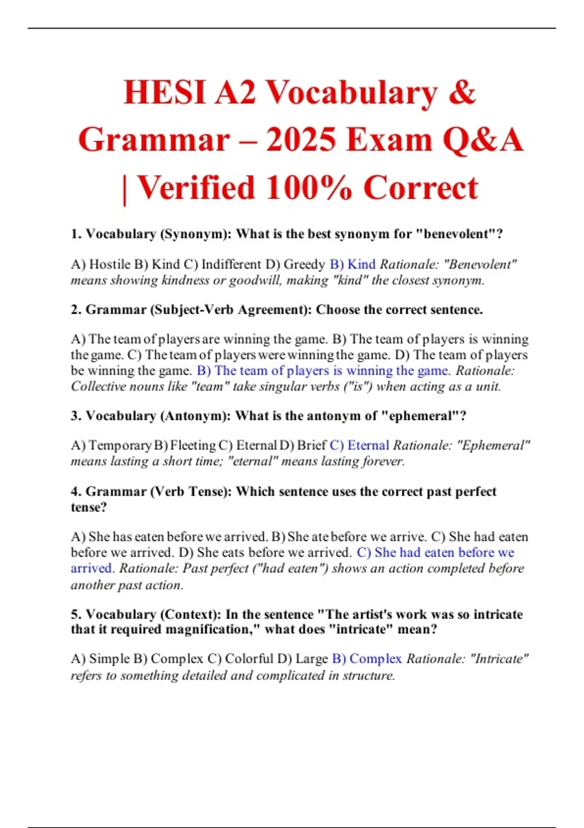 HESI A2 Vocabulary & Grammar – 2025 Exam Q&A | Verified 100% Correct
