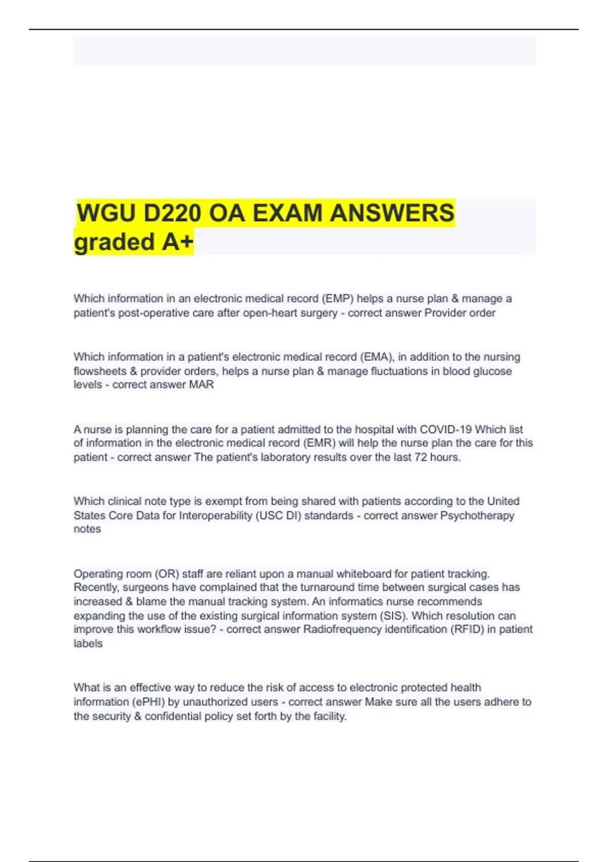 This document provides the complete and verified answers for the WGU D220 Organizational Behavior OA Exam, graded A+. It covers all exam questions related to key organizational behavior concepts such as leadership theories, motivation, team dynamics, communication, organizational culture, and decision-making. Designed for WGU students preparing for the D220 Objective Assessment, this resource helps clarify correct answers and improve understanding of course material aligned with WGU’s performance standards.