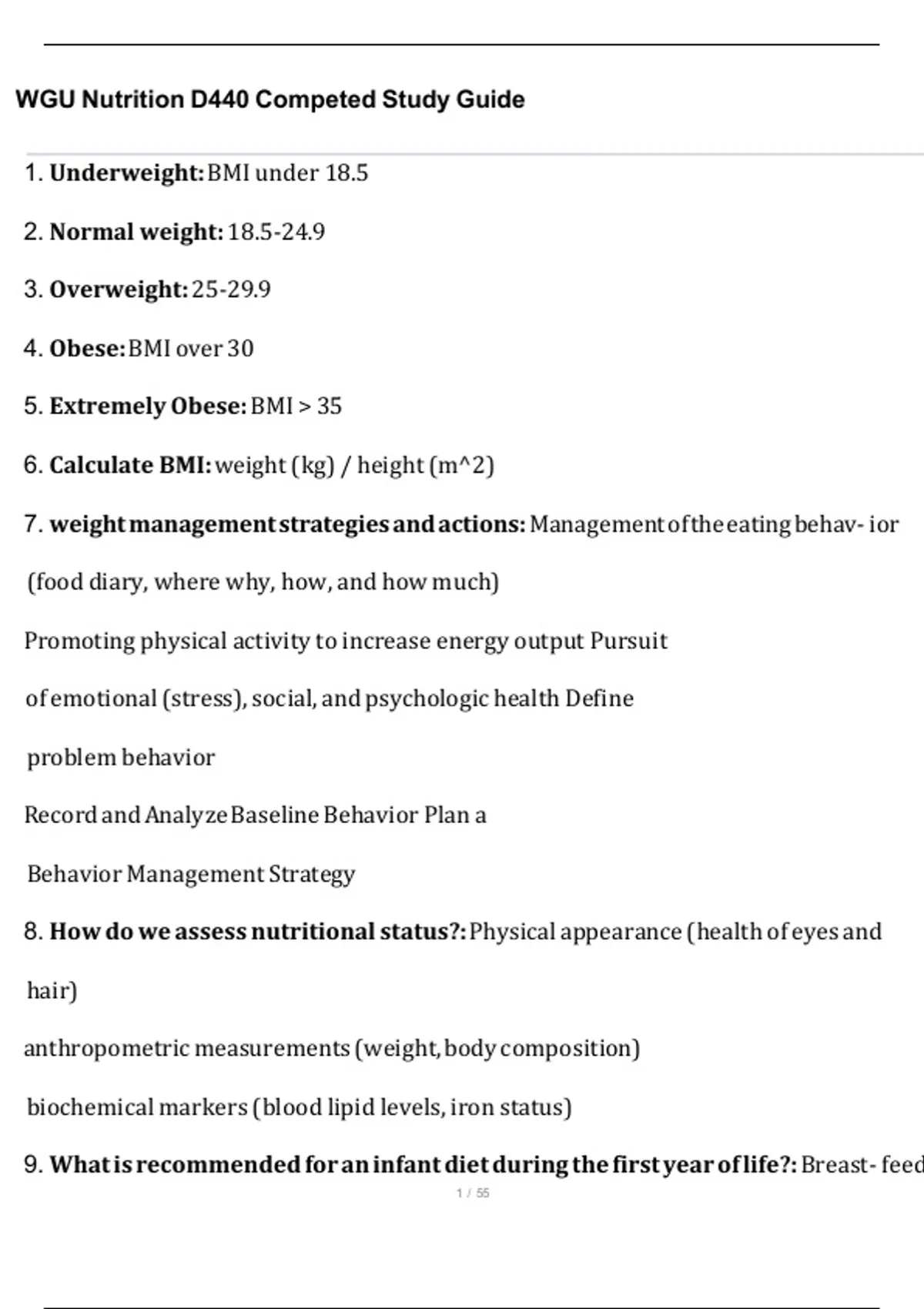 This document is a comprehensive study guide for WGU’s D440 Nutrition course, designed to support students in mastering key concepts and competencies. It covers essential topics such as macronutrients, micronutrients, digestion and absorption, metabolism, dietary guidelines, and nutritional assessment. The guide includes concise summaries, key definitions, and exam-focused notes to help learners prepare effectively for the Objective Assessment (OA) and performance tasks. Ideal for WGU students aiming to complete the D440 Nutrition course with confidence.