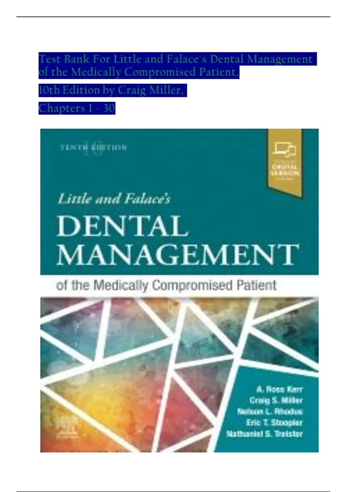This complete test bank covers all 30 chapters from Little and Falace’s Dental Management of the Medically Compromised Patient (10th Edition) by Craig Miller. It includes exam-style questions, case-based clinical scenarios, and verified answers focused on managing dental care for patients with complex medical conditions. Designed for dental students and professionals, this resource supports comprehensive understanding of systemic disease implications in dental practice and safe patient management strategies.
