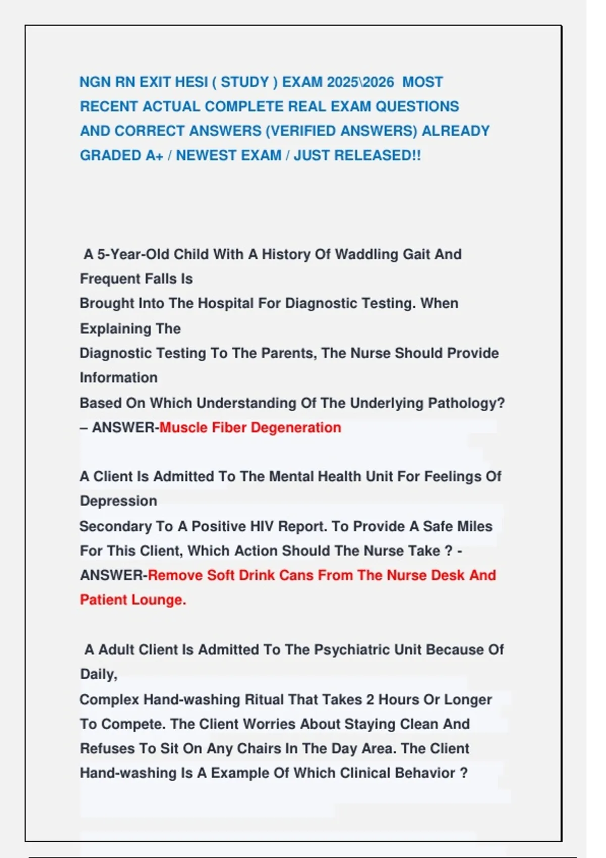 NGN RN EXIT HESI ( STUDY ) EXAM MOST RECENT ACTUAL COMPLETE REAL EXAM QUESTIONS AND CORRECT ANSWERS (VERIFIED ANSWERS) ALREADY GRADED A+ / NEWEST EXAM / JUST RELEASED!!