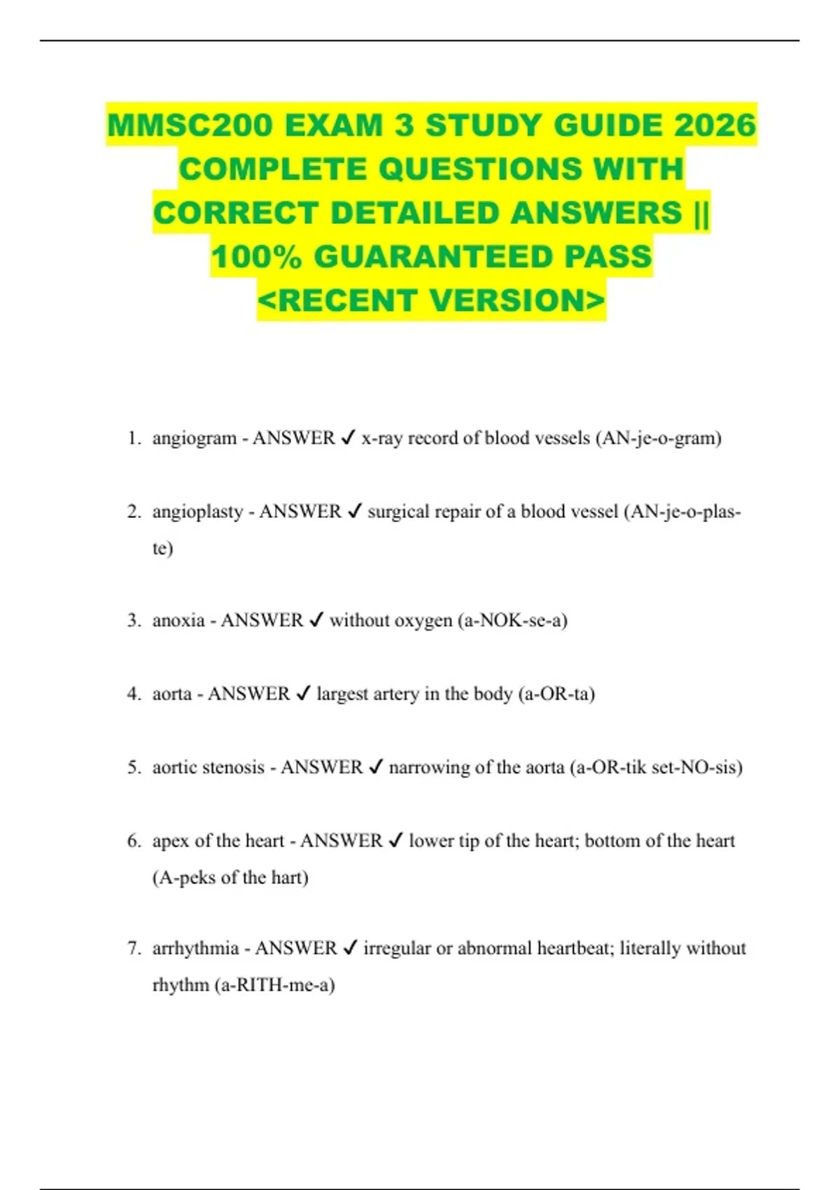 MMSC200 EXAM 3 STUDY GUIDE 2026 COMPLETE QUESTIONS WITH CORRECT DETAILED ANSWERS || 100% GUARANTEED PASS &lt;RECENT VERSION&gt; 1. angiogram - ANSWER x-ray record of blood vessels (AN-je-o-gram) 2. angioplasty - ANSWER surgical repair of a blood vessel (AN-je-o-plas te) 3. anoxia - ANSWER without oxygen (a-NOK-se-a) 4. aorta - ANSWER largest artery in the body (a-OR-ta) 5. aortic stenosis - ANSWER narrowing of the aorta (a-OR-tik set-NO-sis) 6. apex of the heart - ANSWER lower tip of the heart; bottom of the heart (A-peks of the hart) 7. arrhythmia - ANSWER irregular or abnormal heartbeat; literally without rhythm (a-RITH-me-a) 8. arterial anastomosis - ANSWER surgical connection between two arteries (ar-TE-re-al a-nas-to-MO-sis) 9. arteriography - ANSWER x-ray recording of arteries; contrast is injected (ar-te-re-OG-ra-fe) 10. arteriole - ANSWER small artery (ar-TE-re-ol) 11. arteriosclerosis - ANSWER hardening of an artery with collection of fatty plaque (ar-te-re-o-skle-RO-sis) 12. artery - ANSWER largest type of blood vessel; a blood vessel that carries blood away from the heart (AR-te-re) 13. atherectomy - ANSWER removal of plaque (lipids and clots) that accumulate in the lining of an artery (a-the-REK-to-me) 14. atheroma - ANSWER mass of fatty plaque that collects in an artery (ath er-O-ma) 15. atherosclerosis - ANSWER fatty plaque deposits in the interior lining of an artery; a form of arteriosclerosis (ath-er-o-skle-RO-sis) 16. atrial - ANSWER pertaining to the atrium (upper chamber of the heart) (A-tre-al) 17. Pleurodynia - ANSWER Pain in the chest wall muscles that is aggravated by breathing 18. -lysis - ANSWER breakdown, destruction, separation 19. -megaly - ANSWER enlargement 20. -ist - ANSWER specialist 21. -ole - ANSWER little, small 22. karyotyping - ANSWER A process in which metaphase chromosomes are stained, ordered, and numbered according to size, arm-length ratio, and banding pattern. Can be performed on a sample of blood, bone marrow, amniotic fluid, or placental tissue. Used to Dx chromosomal imbalances (e.g., autosomal trisomies, microdeletions, sex chromosome d/o's). 23. -centesis - ANSWER Surgical puncture to remove fluid 24. Tonsillitis - ANSWER inflammation of the tonsils 25. Uvula - ANSWER soft tissue hanging from the middle of the soft palate 26. Splenomegaly - ANSWER Enlarged spleen 27. Blepharoptosis - ANSWER Drooping eyelids 28. Ptosis - ANSWER drooping 29. Arteriole - ANSWER Small artery (arteries carry blood rich in oxygen from the heart to the organs) 30. Venule - ANSWER small vein that carry oxygen poor blood 31. hernia - ANSWER protrusion of any organ through the structure that normally contains it 32. Inguinal hernia - ANSWER the protrusion of a small loop of bowel through a weak place in the lower abdominal wall or groin 33. Erythrocytes - ANSWER red blood cells 34. Leukocytes - ANSWER white blood cells 35. The three Granulocytes - ANSWER basophils, eosinophils, neutrophils (BEN)