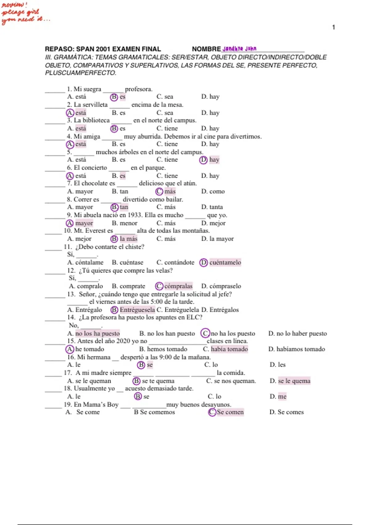 SPAN 2001 Final Review with corrected answers highlighted/red