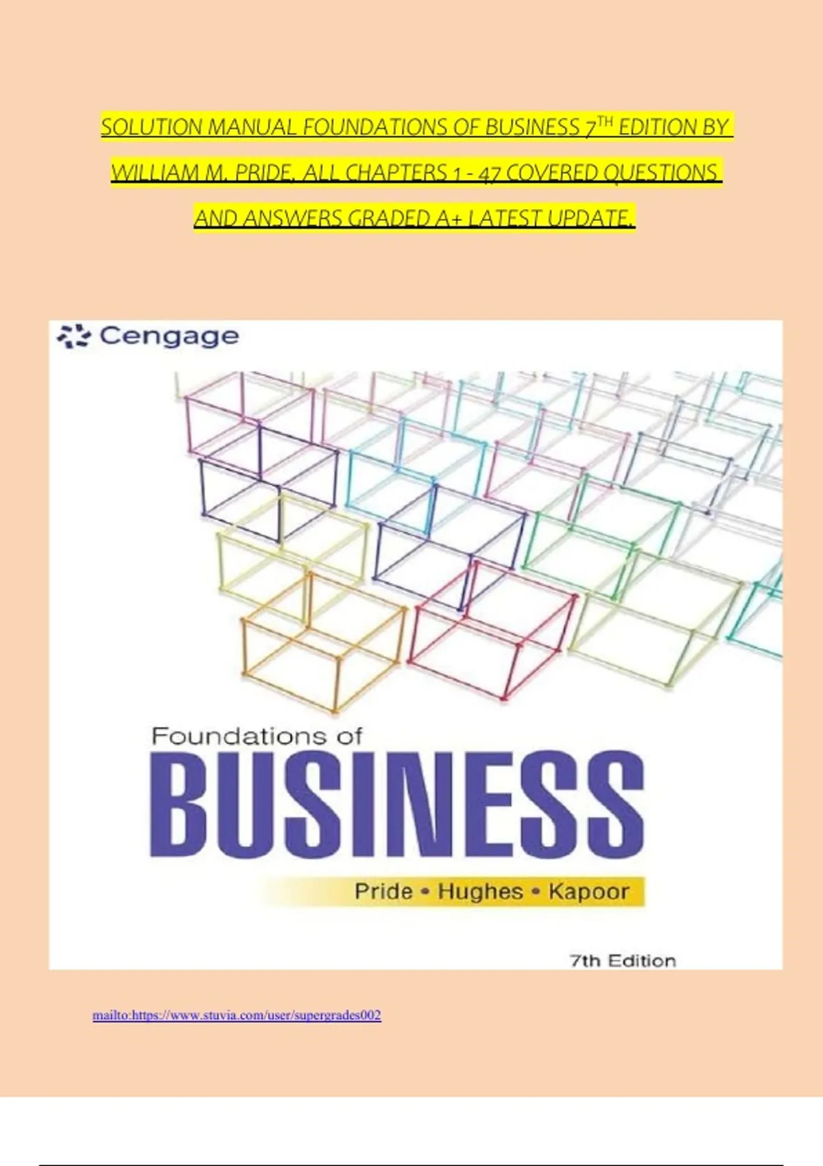 This solution manual for Foundations of Business (7th Edition) by William M. Pride provides complete solutions for all chapters from 1 to 47, featuring graded A+ answers and the latest verified content update. It offers clear, step-by-step explanations for end-of-chapter questions, case studies, and review exercises. The material covers essential business topics including management, marketing, finance, entrepreneurship, economics, and business ethics, making it a valuable study aid for undergraduate business and management students preparing for exams or assignments.