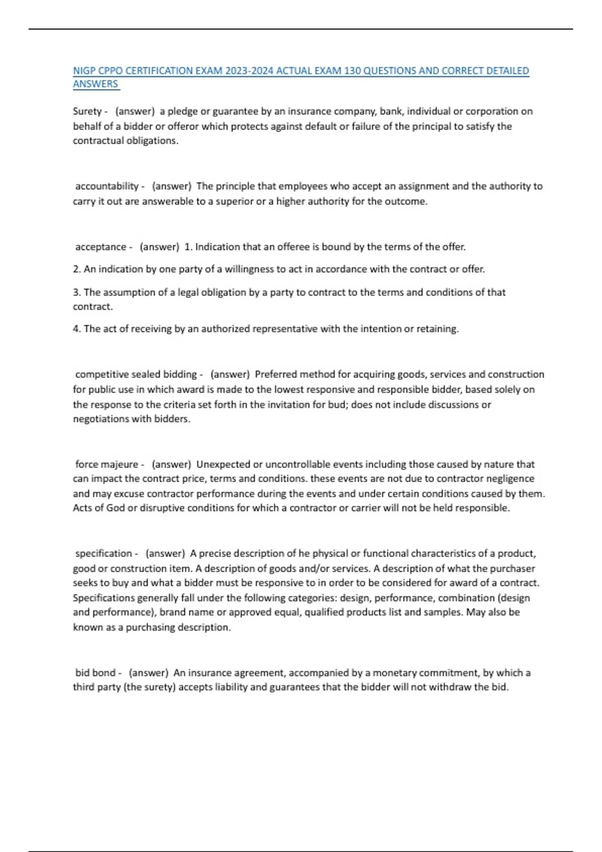 , NIGP CPPO CERTIFICATION EXAM 2023-2024 ACTUAL EXAM 130 QUESTIONS AND CORRECT DETAILED