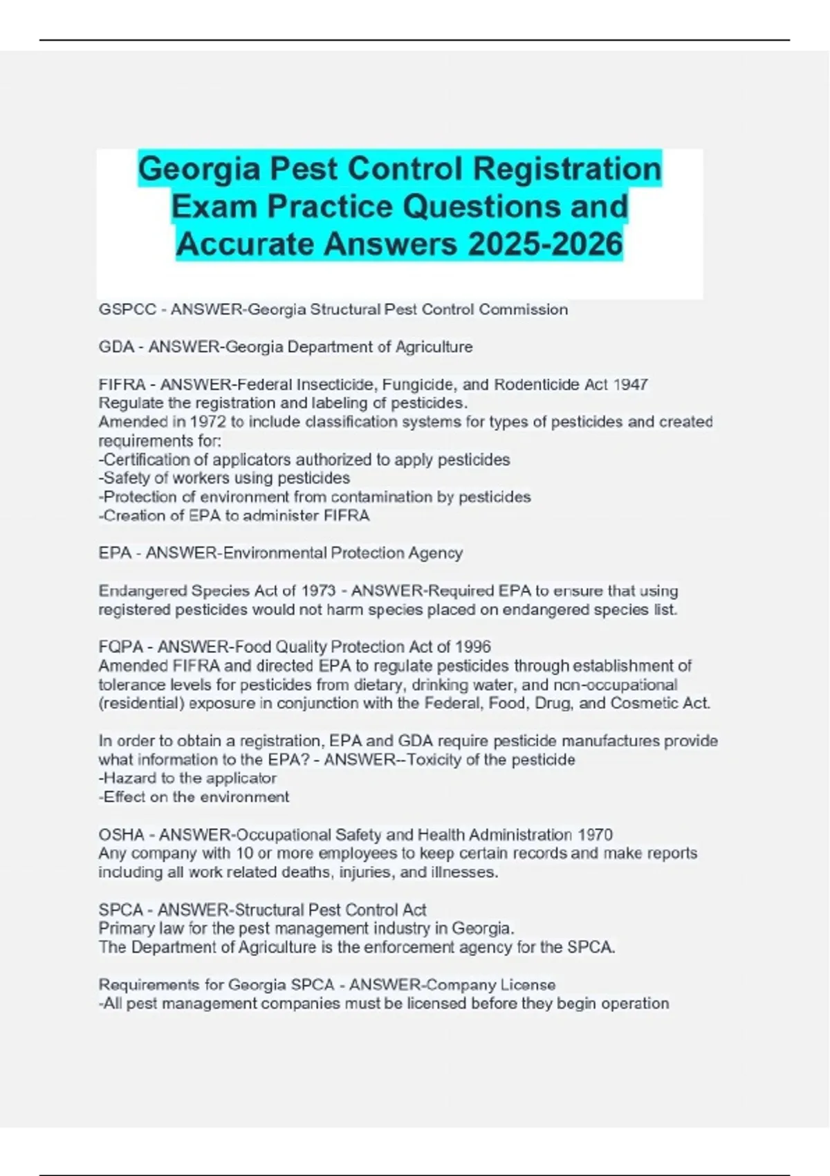 Georgia Pest Control Registration Exam Practice Questions and Accurate Answers GSPCC - ANSWER-Georgia Structural Pest Control Commission GDA - ANSWER-Georgia Department of Agriculture FIFRA - ANSWER-Federal Insecticide, Fungicide, and Rodenticide Act 1947 Regulate the registration and labeling of pesticides. Amended in 1972 to include classification systems for types of pesticides and created requirements for: -Certification of applicators authorized to apply pesticides -Safety of workers using pesticides -Protection of environment from contamination by pesticides -Creation of EPA to administer FIFRA EPA - ANSWER-Environmental Protection Agency Endangered Species Act of 1973 - ANSWER-Required EPA to ensure that using registered pesticides would not harm species placed on endangered species list. FQPA - ANSWER-Food Quality Protection Act of 1996 Amended FIFRA and directed EPA to regulate pesticides through establishment of tolerance levels for pesticides from dietary, drinking water, and non-occupational (residential) exposure in conjunction with the Federal, Food, Drug, and Cosmetic Act. In order to obtain a registration, EPA and GDA require pesticide manufactures provide what information to the EPA? - ANSWER--Toxicity of the pesticide -Hazard to the applicator -Effect on the environment OSHA - ANSWER-Occupational Safety and Health Administration 1970 Any company with 10 or more employees to keep certain records and make reports including all work related deaths, injuries, and illnesses. SPCA - ANSWER-Structural Pest Control Act Primary law for the pest management industry in Georgia. The Department of Agriculture is the enforcement agency for the SPCA. Requirements for Georgia SPCA - ANSWER-Company License -All pest management companies must be licensed before they begin operation Certified Operator -Every pest management company (branch) must employee at least one person who has taken and passed the certification exam. Registered Employees -all non-certified technicians must be registered, in order to work without the presence of a certified or registered employee. Re-certification/re-registration -All certified and registered employees must be re-certified and re-registered periodically. Re-certification -5 years -HPC- 25 hours -WDO- 25 hours -FUM- 12 hours Re-registration -2 years -HPC- 8 hours -WDO- 8 hours -FUM- 3 hours Designated Certified Operators (DCO) Categories - ANSWER-WDO- Wood Destroying Organisms HPC- Household Pest Control FUM- Fumigation Contracts for Control of WDO - ANSWER-A contract must be issued for every WDO service before the work begins. Copied must be kept for 2 years following the expiration of the contract. Comprehensive Post Construction Soil Termiticide Application for Subterranean Termites - ANSWER-Removal of all cellulosic material from under the building Removal of all wood to earth contacts except pressure treated wood designed for ground contact Removal of all visible and accessible termite tunnels Application of of an approved termiticide to all exterior and interior soils Defined Post Construction Soil Termiticide Application for Subterranean Termites - ANSWER-Removal of all cellulosic material from under the building Removal of all wood to earth contacts except pressure treated wood designed for ground contact Removal of all accessible termite tunnels Application of of an approved termiticide Post Construction Soil Termiticide Application for Subterranean Termites, Other than Baits - ANSWER-Removal of all cellulosic material from under the building Removal of all wood to earth contacts except pressure treated wood designed for ground contact Removal of all visible and accessible termite tunnels Application of of an approved termiticide Post Construction Termiticide Bait Application for Subterranean Termites - ANSWER-Removal of all cellulosic material from under the building Removal of all wood to earth contacts except pressure treated wood designed for ground contact Removal of all visible and accessible termite tunnels Install/service an approved baiting system Pre-Construction Termiticide Bait Application for Subterranean Termites - ANSWER-Systems must be monitored for one year at no additional cost when installed for pre-construction or to control infestations found during the coverage period of an official Georgia Wood Infestation Inspection Report. Alternate Application Techniques (AAT) - ANSWER-AATs must be approved by the commission prior to use Removal of all cellulosic material from under the building Removal of all wood to earth contacts except pressure treated wood designed for ground contact Removal of all visible and accessible termite tunnels Application of an approved soil termiticide, where application includes all areas specified in defined, comprehensive, or pre-construction treatments Treatment of Powder Post Beetles and Wood Borers - ANSWER-Application of an approved pesticide Ventilation of the under-floor space between the bottom of the floor joists and the earth to meet the requirements of the International Residential Building Code for one and two family dwellings Treatment of Wood Decay Fungi - ANSWER-Ventilation of the under-floor space between the bottom of the floor joists and the earth to meet the requirements of the International Residential Building Code for one and two family dwellings Installation of a vapor barrier to cover a minimum of 70% of the exposed soil surface in a crawl space Treatment of Dry Wood Termites - ANSWER-Application of an approved pesticide Treatment of Schools - ANSWER-Treatment of Schools involves taking special precautions to minimize the potential exposure of students to pesticides. -Application of pesticides in rooms vacant for 3+ hours Continues...