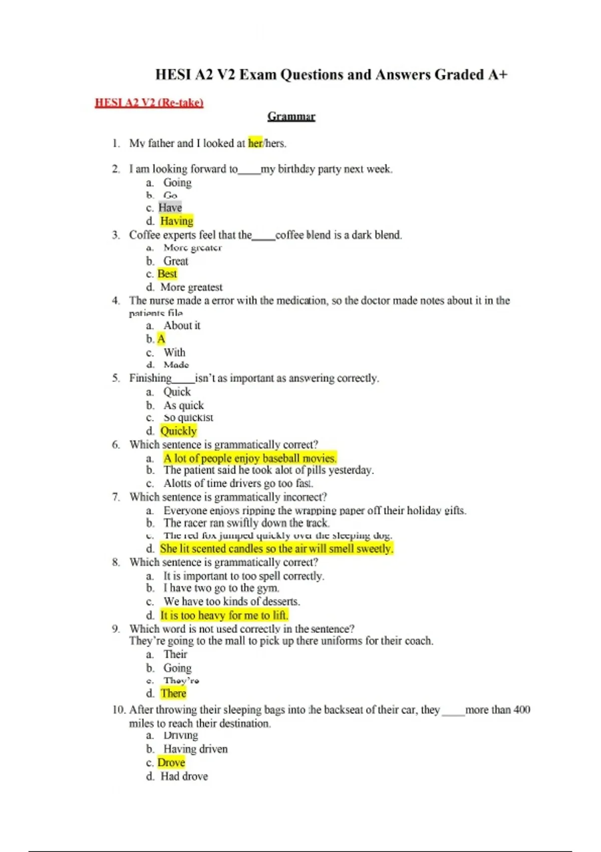 1. My father and I looked at her/hers. 2. I am looking forward to my birthday party next week. a. Going b. Go c. Have d. Having 3. Coffee experts feel that the coffee blend is a dark blend. a. More greater b. Great c. Best d. More greatest 4. The nurse made a error with the medication, so the doctor made notes about it in the patients file. a. About it b. A c. With d. Made 5. Finishing isn’t as important as answering correctly. a. Quick b. As quick c. So quickist d. Quickly 6. Which sentence is grammatically correct? a. A lot of people enjoy baseball movies. b. The patient said he took alot of pills yesterday. c. Alotts of time drivers go too fast. 7. Which sentence is grammatically incorrect? a. Everyone enjoys ripping the wrapping paper off their holiday gifts. b. The racer ran swiftly down the track. c. The red fox jumped quickly over the sleeping dog. d. She lit scented candles so the air will smell sweetly. 8. Which sentence is grammatically correct? a. It is important to too spell correctly. b. I have two go to the gym. c. We have too kinds of desserts. d. It is too heavy for me to lift. 9. Which word is not used correctly in the sentence? They’re going to the mall to pick up there uniforms for their coach. a. Their b. Going c. They’re d. There 10. After throwing their sleeping bags into the backseat of their car, they ____ more than 400 miles to reach their destination. a. Driving b. Having driven c. Drove d. Had drove 11. Place the four words in alphabetical order. a. Assemble, assembled, assembling, assembly b. Assembly, assemble, assembled, assembling c. Assemble, assembly, assembling, assembled d. Assemble, assembly, assembled, assembling 12. The shopper was angry when he realized he it cheaper at the other store. a. Get b. Could have got c. Could have gotten d. Might have get 13. Which sentence is not grammatically correct? a. Because he did not examine the patient, the healthcare provider prescribed her with the wrong medication. b. The nurse decided to bathe the client, than trim his nails. c. The dietician, through negligence, made a mistake with the diet plan. d. Since the child was feeling ill, the nurse sent him home. 14. What is a salutation in this address? a. 1600 Pennsylvania Ave. b. 20003 (Area code) c. Ryan d. Mr. 15. I the package on the table. a. Layed b. Drop c. Laid d. Lay 16. Which sentence uses fast as an adverb? a. The cars on the overpass moved fast. b. The clock on the wall is 10 minutes fast. c. The batter could not hit the fast pitch d. The fast cars drove over the bridge 17. Most children must learn for the importance of good manners. a. Themself b. Theirself c. Theirselves d. Themselves 18. Be careful not to the bottle while you carry it to the table. a. Brak b. Break c. Brick d. Brake 19. She went to the party her dislike for the host. a. Despite of b. Even though c. Although d. In spite of 20. Which word is not grammatically correctly? During the time he lived in New York, he worked as a writer, an editor, and a library. a. An b. Library c. As d. During 21. A sentence must always begin with a capital letter, but many people forget this rule. a. Must always b. Simple c. Forget d. Capital 22. Which sentence is grammatically correct? a. He did bad on the test. b. He felt bad about the broken window. c. He felt badly about being late. d. When the patient feels badly, give him an aspirin. 23. During the fight, I was hit on the . a. Head b. On head c. A head d. The head 24. Which sentence is grammatically correct? a. The results suggests the patient has a bacterial infection. b. Harmony are agreeable features of classical music. c. The student were excited to have passed the test. d. The bottle of tablets has an expired expiration date. 25. My sister gave the chocolate bar to my friend and . a. Myself b. Me c. Us d. We 26. Which of the sentences below are incomplete sentences? a. We sat out the next dance. b. While the band played. c. The band played a nice slow song. d. Everyone enjoyed the dance. 27. Which sentence is grammatically correct? a. It was me who lost. b. It was I who won. c. The winner was him d. The runner was her. 28. Which sentence is grammatically correct? a. She went to the room at the appointed time. b. I want ice cream to. c. The nurse gave me to shots. d. The patient was to cold. 29. The men and women of the graduating class their caps in the air. a. Thorough b. Through c. Threw d. Throwing 30. Which sentence is grammatically correct? a. My parent’s advice me of all my major transactions. b. Elle advised me to go to the dance. c. We advice all new freshmen to take a public speaking class. d. I need some good advise on how to breakup with my girlfriend. 31. Use the verb correctly. a. A pitchfork and a halter was left on the concrete floor. b. There are a pig, sheep, and horse in the red trailer. c. Here is the cages for the 2 rabbits and 2 chickens. d. Sherri and her cousin were at the County fair this year. 32. Which sentence is grammatically correct? a. Him and I are the best drivers during the day time. b. Him and me drove 6 hours to our hometown. c. Me and him took put the dirty laundry in the trunk. d. He and I took turns driving every hour after dark. 33. Which sentence is the verb used correctly? a. I seen you standing in line at the Tilt-A-Whirl at the country fair. b. I sung the national anthem before the country fair moto-cross race. c. I ran toward the country fair arena with Nibbles the Rabbit. d. I wore a white shirt and dark jeans to show my goat at the country fair. 34. Which word is not correctly used in the sentence? Confidentiality be observed at all times, so the nurse should not discuss clients when the conversation can be overheard. a. Be observed b. By c. Can be d. Should not 35. Which sentence is grammatically correct? a. Sam behaved bad during Mr. Johnson’s lecture. b. Mona performed badly during dance class. c. The chem lab after 3rd period smells badly. d. Joe limped bad after his collision in gym c
