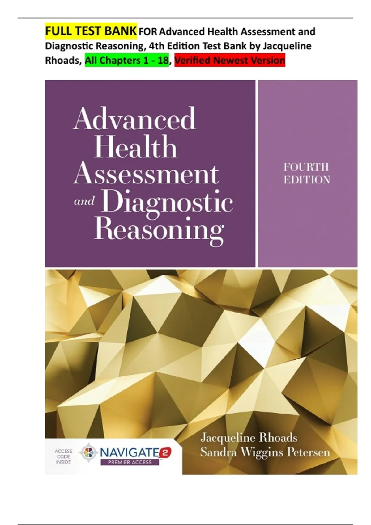 Advanced Health Assessment and Diagnostic Reasoning, 4th Edition Test Bank by Jacqueline Rhoads,|| ISBN:NO 9781284170313||All Chapters 1 - 18, Verified Newest Version