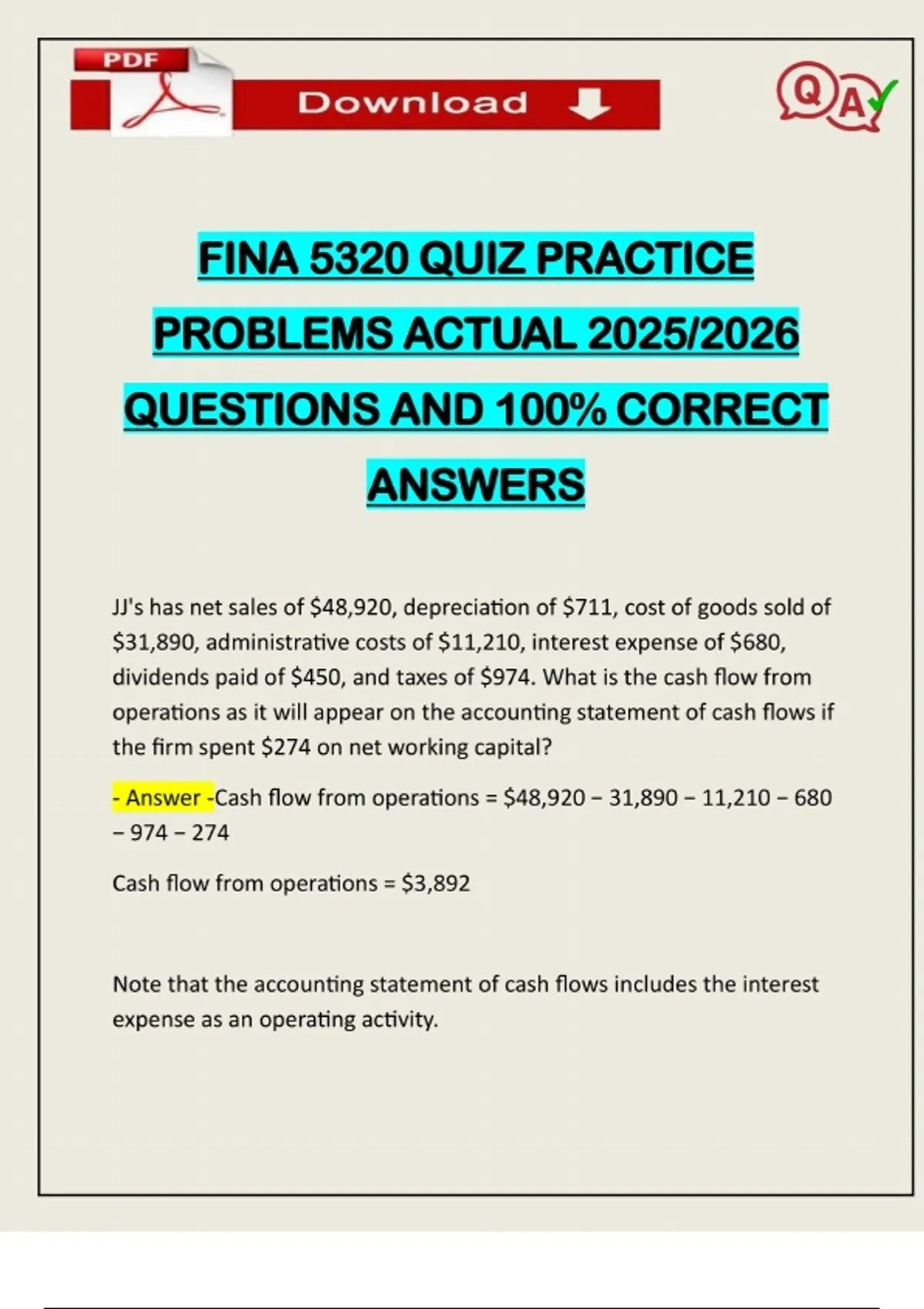 FINA 5320 QUIZ PRACTICE PROBLEMS ACTUAL 2025/2026 QUESTIONS AND 100% CORRECT ANSWERS JJ's has net sales of $48,920, depreciation of $711, cost of goods sold of $31,890, administrative costs of $11,210, interest expense of $680, dividends paid of $450, and taxes of $974. What is the cash flow from operations as it will appear on the accounting statement of cash flows if the firm spent $274 on net working capital? - Answer -Cash flow from operations = $48,920 − 31,890 − 11,210 − 680 − 974 − 274 Cash flow from operations = $3,892 Note that the accounting statement of cash flows includes the interest expense as an operating activity.Need assistance on Online classes, Exams & Assignments? Reach out for instant help!! Full Course Assistance, Plagiarism-free Essay Writing, Research Paper, Dissertation, Discussion Posts, etc…. Confidential & Secure services. Tutors are available for all subjects! Email now at: $3,892 Quick Marts increased its cash by $418 this year. The firm