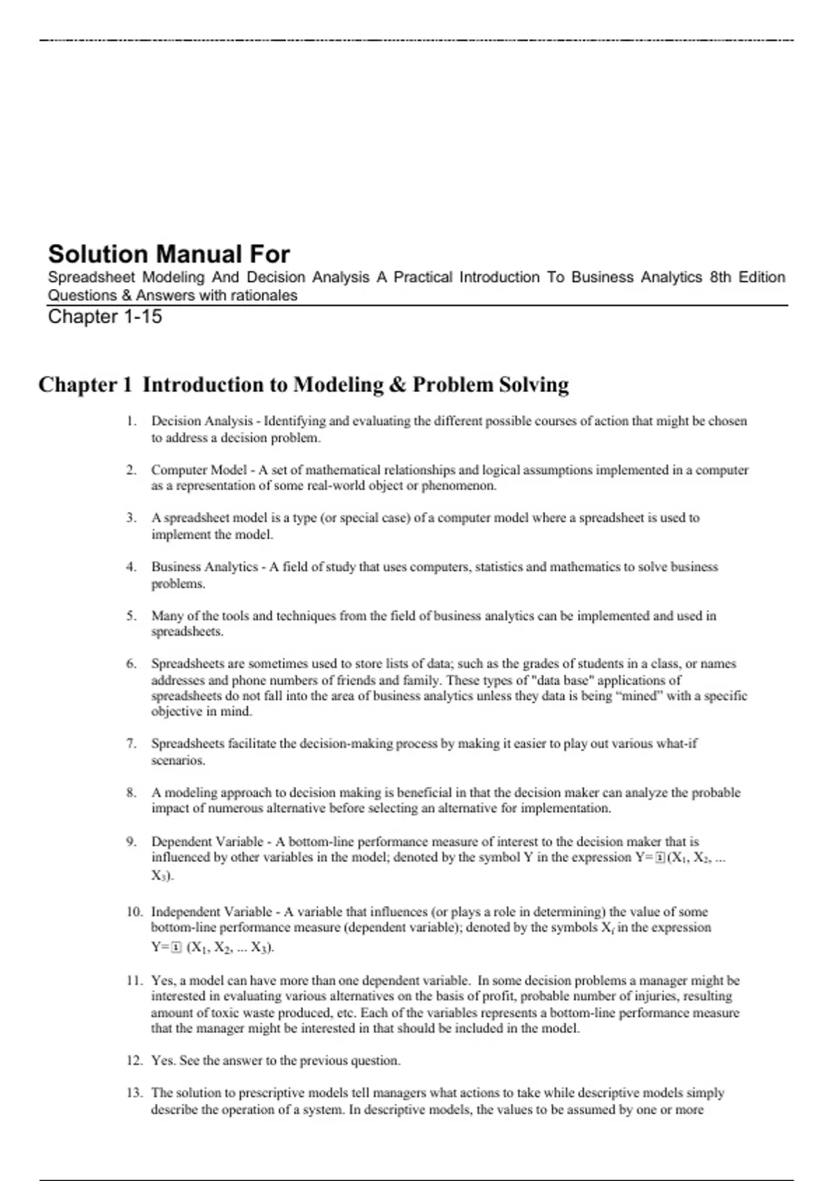 Spreadsheet Modeling And Decision Analysis A Practical Introduction To Business Analytics 8th Edition