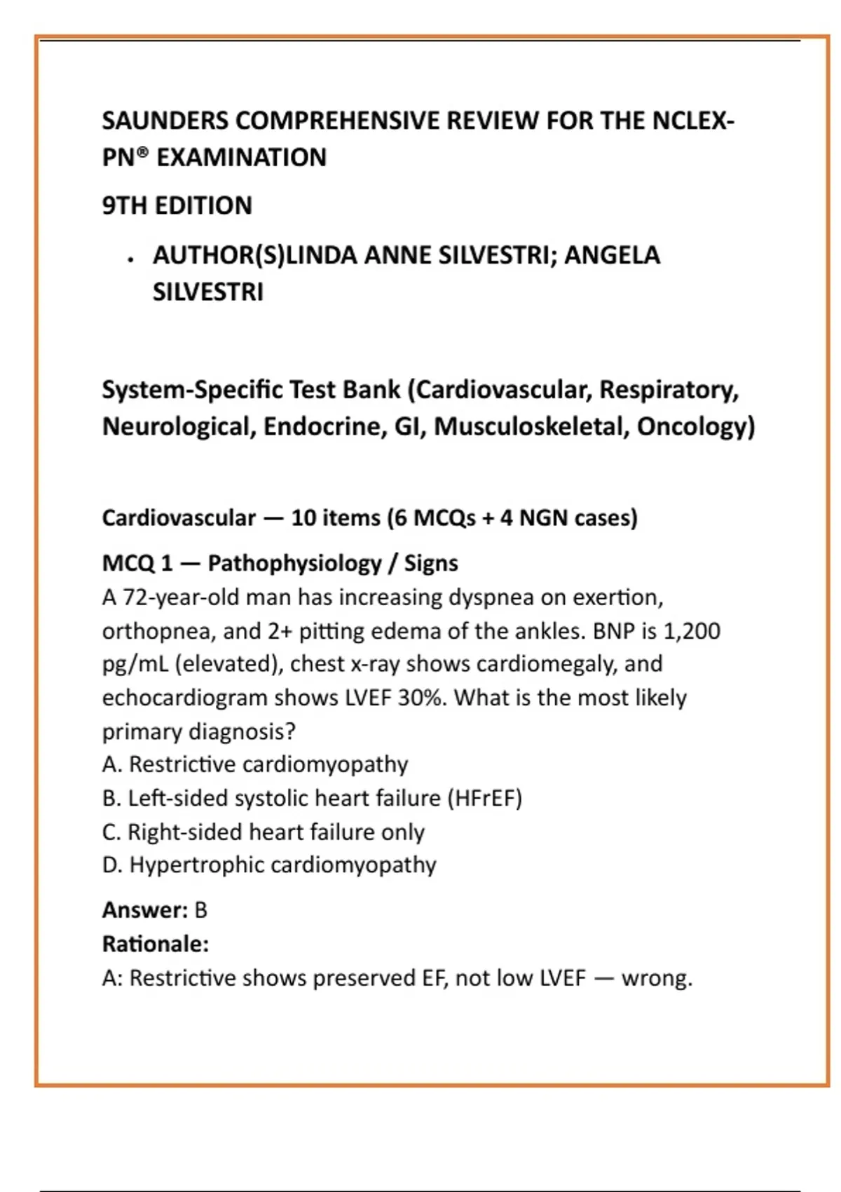 System-Specific Test Bank (Cardiovascular, Respiratory,
