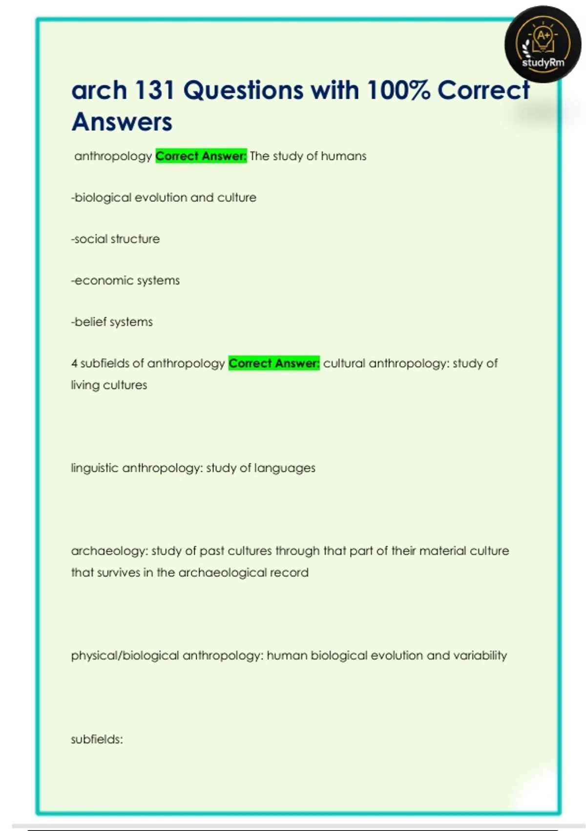 4 subfields of anthropology Correct Answer: cultural anthropology: study of