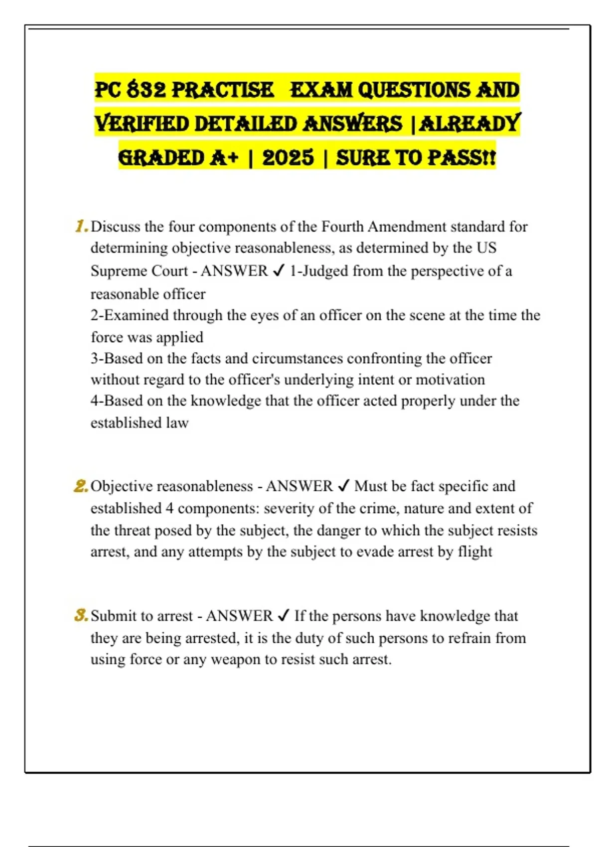 PC 832 PRACTISE EXAM QUESTIONS AND VERIFIED DETAILED ANSWERS |ALREADY GRADED A+ | 2025 | SURE TO PASS!! 1. Discuss the four components of the Fourth Amendment standard for determining objective reasonableness, as determined by the US Supreme Court - ANSWER 1-Judged from the perspective of a reasonable officer 2-Examined through the eyes of an officer on the scene at the time the force was applied 3-Based on the facts and circumstances confronting the officer without regard to the officer's underlying intent or motivation 4-Based on the knowledge that the officer acted properly under the established law 2. Objective reasonableness - ANSWER Must be fact specific and established 4 components: severity of the crime, nature and extent of the threat posed by the subject, the danger to which the subject resists arrest, and any attempts by the subject to evade arrest by flight 3. Submit to arrest - ANSWER If the persons have knowledge that they are being arrested, it is the duty of such persons to refrain from using force or any weapon to resist such arrest. 4. Authority to use restraint - ANSWER An arrest is made by an actual restraint of the person or by the submission to the custody of an officer. 5. Identify the circumstances set forth in the California Penal Code when a peace officer has the authority to the use of force. - ANSWER "Any officer who has reasonable cause to believe that the person to be arrested has committed a public offense may use reasonable force to affect an arrest, to prevent escape, or to overcome resistance. 6. Identify the circumstances set forth in the California Penal Code when a peace officer has the authority to the use of force. continued 1 - ANSWER A peace officer who makes or attempts to make an arrest need not retreat or desist from his efforts by reason of the resistance or threatened resistance of the person being arrested; 7. Identify the circumstances set forth in the California Penal Code when a peace officer has the authority to the use of force. continued 2 - ANSWER nor shall such officer be deemed an aggressor or lose his right to self-defense by the use of reasonable force to effect the arrest or to prevent escape or to overcome resistance." 8. Discuss the level of authority specific agency policies have regarding the use of force by a peace officer. - ANSWER Although the law and courts have presented a foundation for the use of force by a peace officer, the most detailed considerations and regulations are established by each agency's departmental policies. Limitations on the use of force are set by specific agency policy.