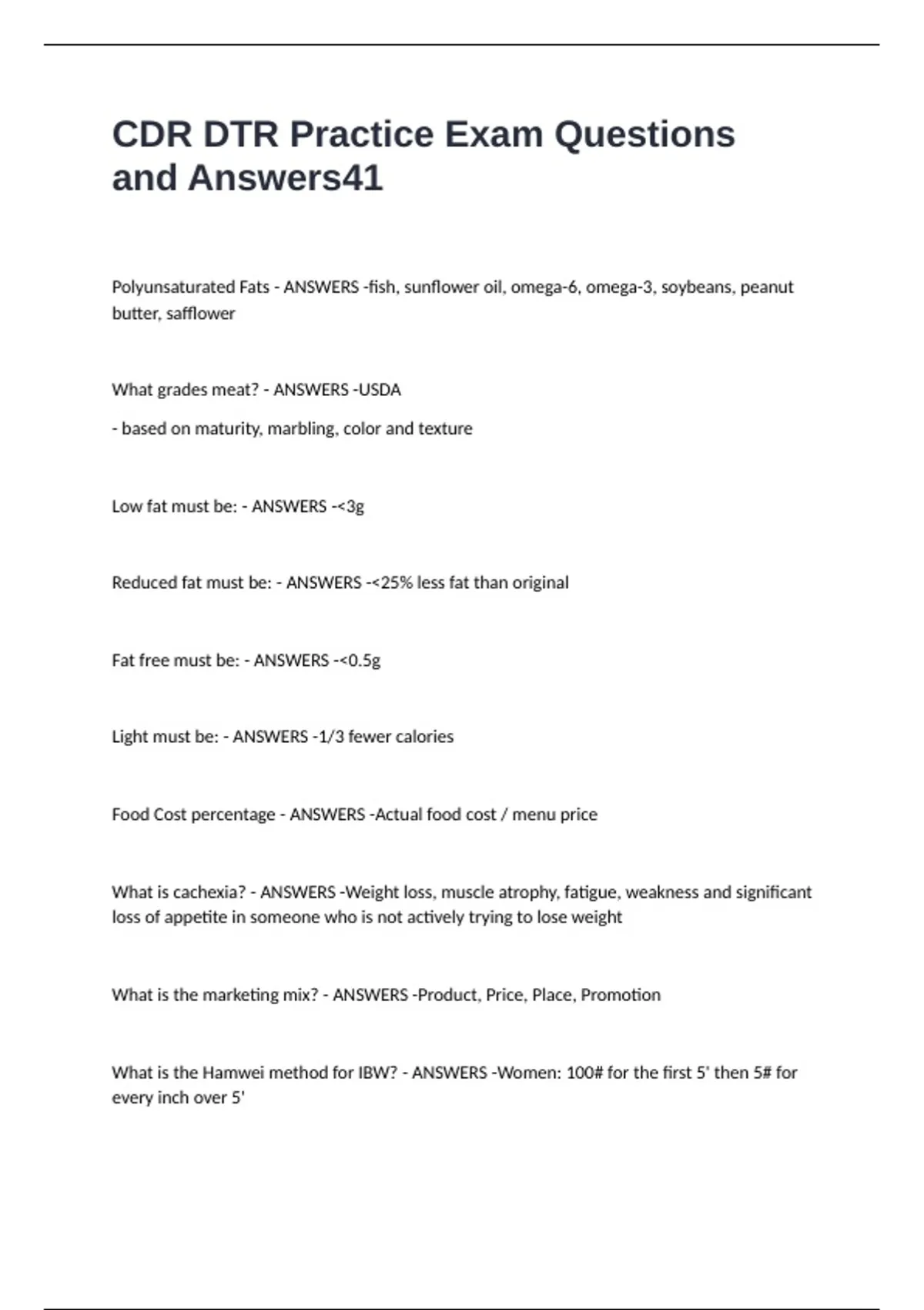 CDR DTR Practice Exam Questions and Answers Polyunsaturated Fats - ANSWERS -fish, sunflower oil, omega-6, omega-3, soybeans, peanut butter, safflower What grades meat? - ANSWERS -USDA - based on maturity, marbling, color and texture Low fat must be: - ANSWERS -<3g Reduced fat must be: - ANSWERS -<25% less fat than original Fat free must be: - ANSWERS -<0.5g Light must be: - ANSWERS -1/3 fewer calories Food Cost percentage - ANSWERS -Actual food cost / menu price What is cachexia? - ANSWERS -Weight loss, muscle atrophy, fatigue, weakness and significant loss of appetite in someone who is not actively trying to lose weight What is the marketing mix? - ANSWERS -Product, Price, Place, Promotion What is the Hamwei method for IBW? - ANSWERS -Women: 100# for the first 5' then 5# for every inch over 5'