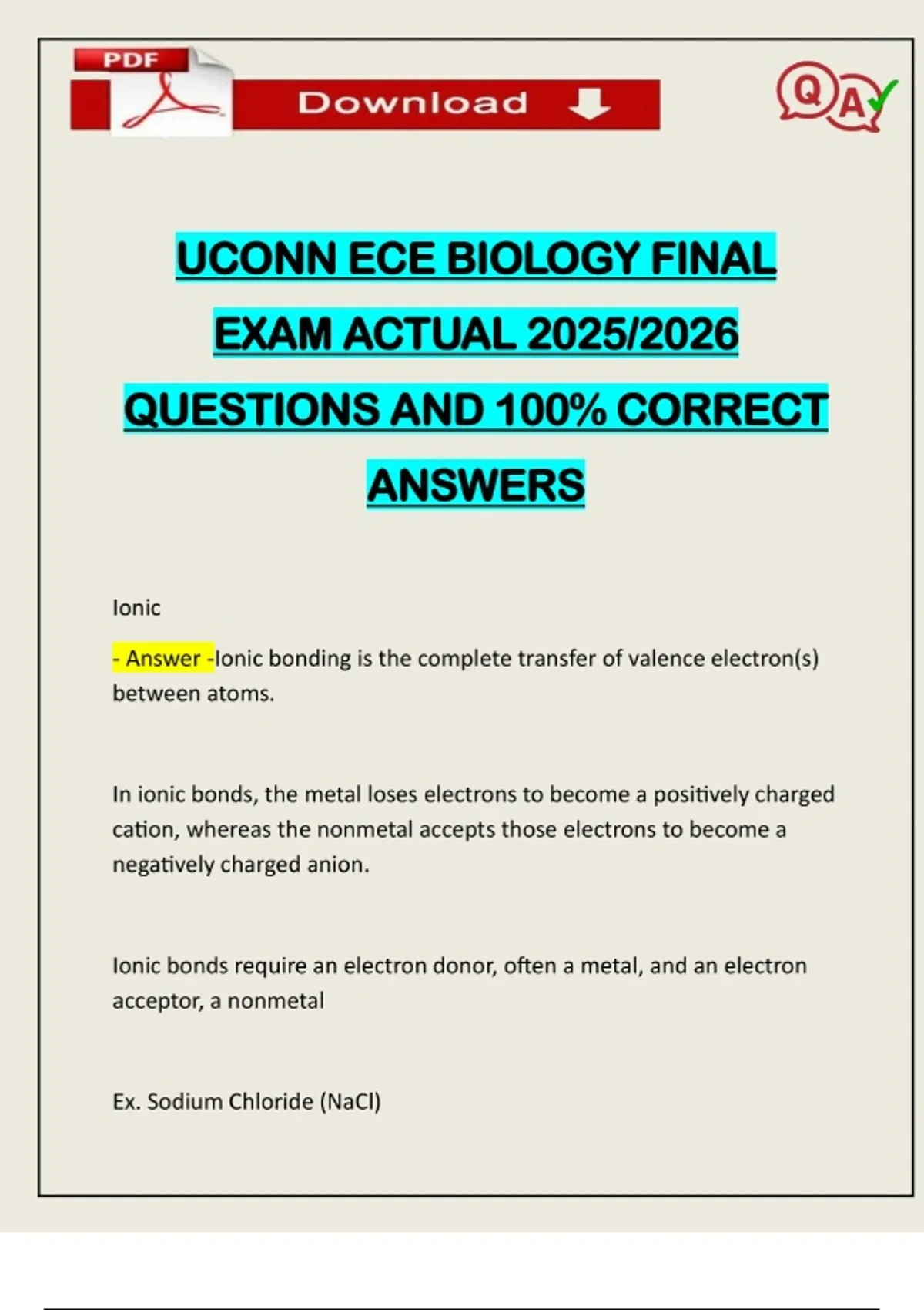 UCONN ECE BIOLOGY FINAL EXAM ACTUAL 2025/2026 QUESTIONS AND 100% CORRECT ANSWERS Ionic - Answer -Ionic bonding is the complete transfer of valence electron(s) between atoms. In ionic bonds, the metal loses electrons to become a positively charged cation, whereas the nonmetal accepts those electrons to become a negatively charged anion. Ionic bonds require an electron donor, often a metal, and an electron acceptor, a nonmetal Ex. Sodium Chloride (NaCl)Need assistance on Online classes, Exams & Assignments? Reach out for instant help!! Full Course Assistance, Plagiarism-free Essay Writing, Research Paper, Dissertation, Discussion Posts, etc…. Confidential & Secure services. Tutors are available for all subjects! Email now at: Covalent - Answer -Covalent bonding is the sharing of electrons between atoms. This type of bonding occurs between two atoms of the same element or of elements close to each other in the periodic table. Ex. Water (H2O) Hydrogen - Answer -Weak bond between