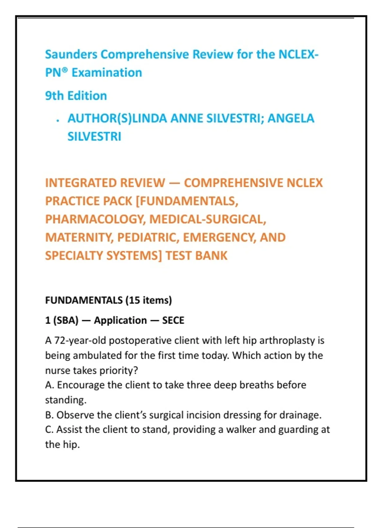 Saunders NCLEX-RN Test Bank 2025 | Comprehensive NGN Practice Pack with Rationales | Clinical Judgment Review Meta Description (150–160 characters) Master NCLEX-RN 2025 with this Saunders-based NGN test bank. 100+ clinical judgment questions, full rationales, and NCLEX-style mastery practice. Targeted SEO Keywords (10–12) NCLEX-RN Test Bank Saunders NCLEX Review NGN Practice Questions NCLEX 2025 Preparation Nursing Exam Study Guide Clinical Judgment Model Saunders Comprehensive Review Next Generation NCLEX Nursing Test Bank Download NCLEX Practice Pack NCLEX-RN Rationales NCLEX Integrated Review ️ Hashtags (for social sharing / discovery) #NCLEXRN #SaundersReview #NursingTestBank #NextGenNCLEX #NCLEX2025 #NursingStudents #NCLEXPrep #ClinicalJudgment #NurseEducator #StudyWithSaunders Long-Form Product Description (Approx. 500 words)
