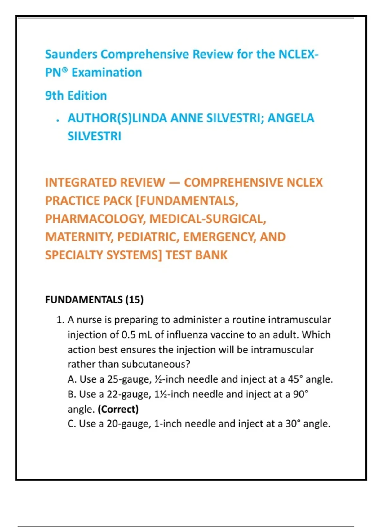 1. A nurse is preparing to administer a routine intramuscular