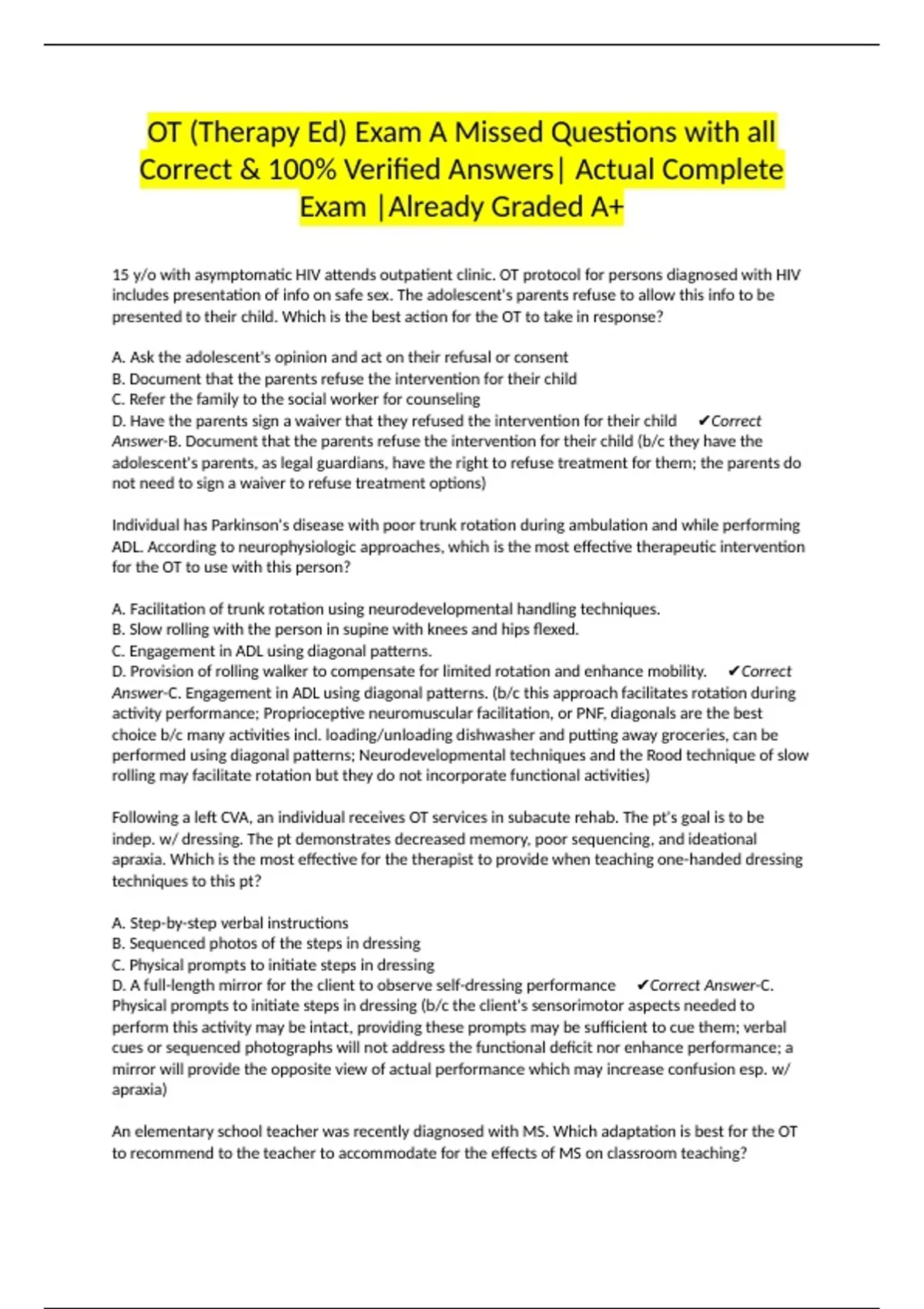 OT (Therapy Ed) Exam A Missed Questions with all Correct & 100% Verified Answers| Actual Complete Exam |Already Graded A+