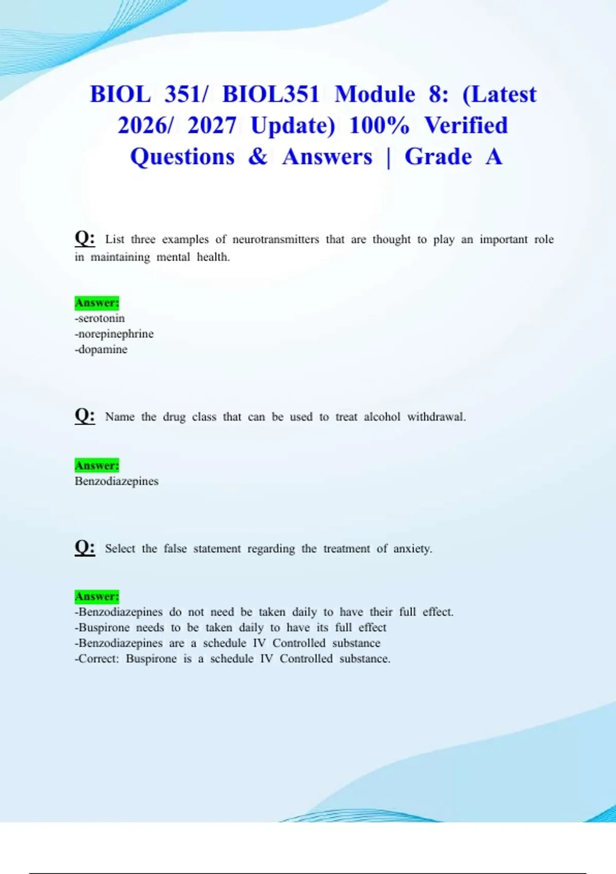 Q:l Selectl thel falsel statementl regardingl thel treatmentl ofl anxiety.
