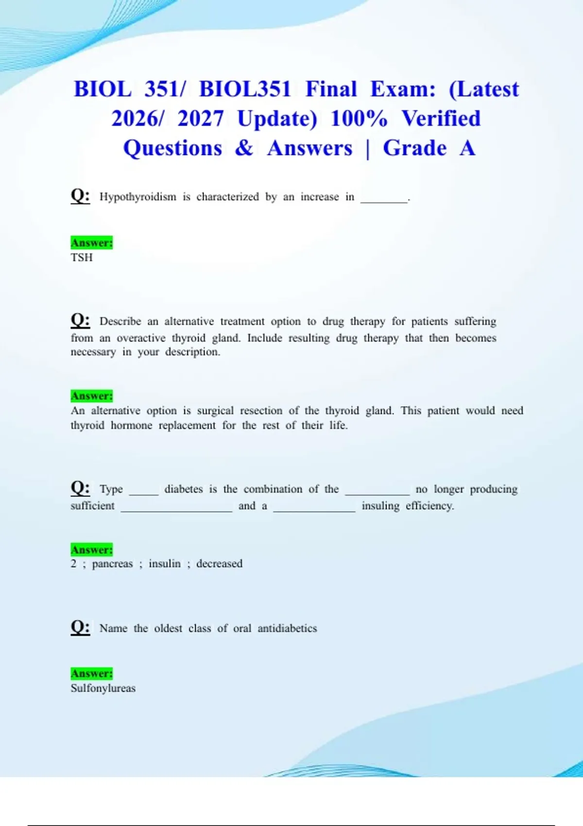 BIOL 351/ BIOL351 Final Exam: (Latest 2026/ 2027 Update) 100% Verified Questions & Answers | Grade A