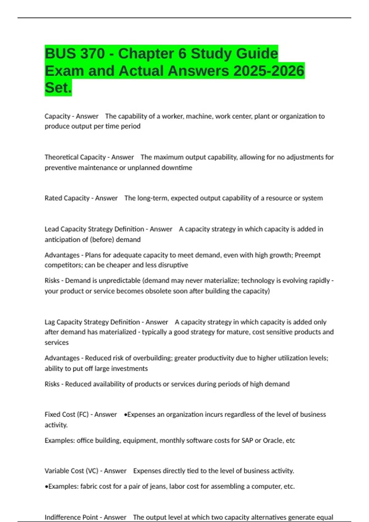 Capacity - Answer The capability of a worker, machine, work center, plant or organization to produce output per time period Theoretical Capacity - Answer The maximum output capability, allowing for no adjustments for preventive maintenance or unplanned downtime Rated Capacity - Answer The long-term, expected output capability of a resource or system Lead Capacity Strategy Definition - Answer A capacity strategy in which capacity is added in anticipation of (before) demand Advantages - Plans for adequate capacity to meet demand, even with high growth; Preempt competitors; can be cheaper and less disruptive Risks - Demand is unpredictable (demand may never materialize; technology is evolving rapidly - your product or service becomes obsolete soon after building the capacity) Lag Capacity Strategy Definition - Answer A capacity strategy in which capacity is added only after demand has materialized - typically a good strategy for mature, cost sensitive products and services Advantages - Reduced risk of overbuilding; greater productivity due to higher utilization levels; ability to put off large investments Risks - Reduced availability of products or services during periods of high demand Fixed Cost (FC) - Answer •Expenses an organization incurs regardless of the level of business activity. Examples: office building, equipment, monthly software costs for SAP or Oracle, etc Variable Cost (VC) - Answer Expenses directly tied to the level of business activity. •Examples: fabric cost for a pair of jeans, labor cost for assembling a computer, etc. Indifference Point - Answer The output level at which two capacity alternatives generate equal cost