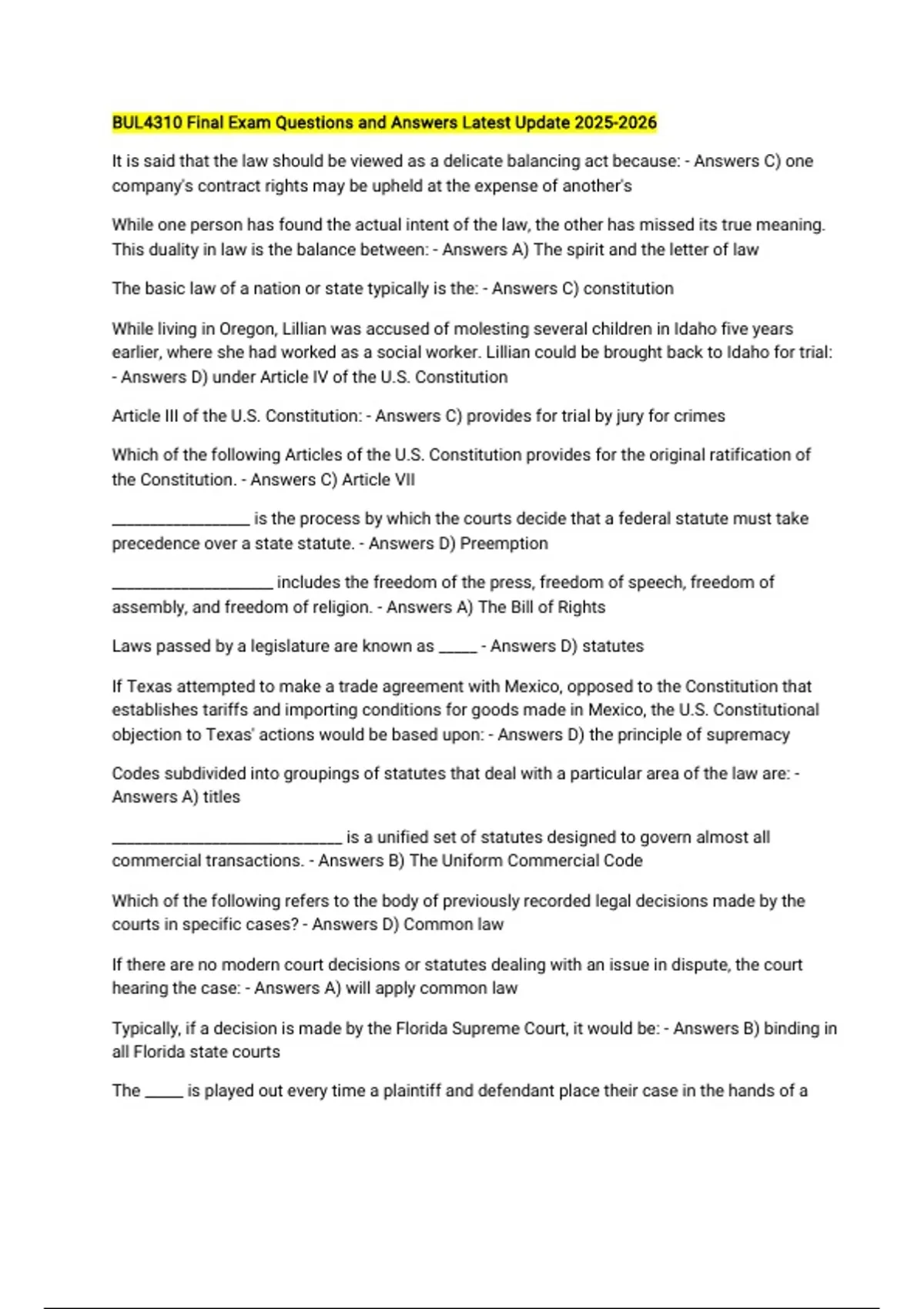 BUL4310 Final Exam Questions and Answers Latest Update It is said that the law should be viewed as a delicate balancing act because: - Answers C) one company's contract rights may be upheld at the expense of another's While one person has found the actual intent of the law, the other has missed its true meaning. This duality in law is the balance between: - Answers A) The spirit and the letter of law The basic law of a nation or state typically is the: - Answers C) constitution While living in Oregon, Lillian was accused of molesting several children in Idaho five years earlier, where she had worked as a social worker. Lillian could be brought back to Idaho for trial: - Answers D) under Article IV of the U.S. Constitution Article III of the U.S. Constitution: - Answers C) provides for trial by jury for crimes Which of the following Articles of the U.S. Constitution provides for the original ratification of the Constitution. - Answers C) Article VII __________________ is the process by which the courts decide that a federal statute must take precedence over a state statute. - Answers D) Preemption _____________________ includes the freedom of the press, freedom of speech, freedom of assembly, and freedom of religion. - Answers A) The Bill of Rights Laws passed by a legislature are known as _____ - Answers D) statutes If Texas attempted to make a trade agreement with Mexico, opposed to the Constitution that establishes tariffs and importing conditions for goods made in Mexico, the U.S. Constitutional objection to Texas' actions would be based upon: - Answers D) the principle of supremacy Codes subdivided into groupings of statutes that deal with a particular area of the law are: - Answers A) titles ______________________________ is a unified set of statutes designed to govern almost all commercial transactions. - Answers B) The Uniform Commercial Code Which of the following refers to the body of previously recorded legal decisions made by the courts in specific cases? - Answers D) Common law If there are no modern court decisions or statutes dealing with an issue in dispute, the court hearing the case: - Answers A) will apply common law Typically, if a decision is made by the Florida Supreme Court, it would be: - Answers B) binding in all Florida state courts The _____ is played out every time a plaintiff and defendant place their case in the hands of a judge or jury. - Answers B) uncertainty principle Most courts with appellate jurisdiction are empowered to determine whether the lower courts have made errors of law. This process is referred to as: - Answers A) plenary review Courts with the power to hear any type of case are said to exercise: - Answers C) general jurisdiction Probate courts and courts of claims are examples of courts with - Answers A) special jurisdiction Joe, a citizen of Ohio, and Maria, a citizen of New Mexico, have an auto accident in New Mexico. For a federal court to hear this case there must be: - Answers C) an amount over $75,000 involved The Federal Circuit was established by Congress primarily to - Answers B) streamline and unify patent law The United States Supreme Court does not have original jurisdiction in which of the following cases? - Answers B) Cases coming from state supreme courts Gordon Gibbs grated his plow along his neighbor's driveway, ruining the driveway. The neighbor wants Gordon to pay the $1,500 cost of paving the driveway. If this case enters litigation, it will most likely be heard by: - Answers D) a small-claims court A case in which one representative party files a lawsuit on behalf of all members of a group of plaintiffs who share a single, similar injury is a(n): - Answers C) class action A credit card company has cheated one million cardholders out of 50 cents each. Marlene, on