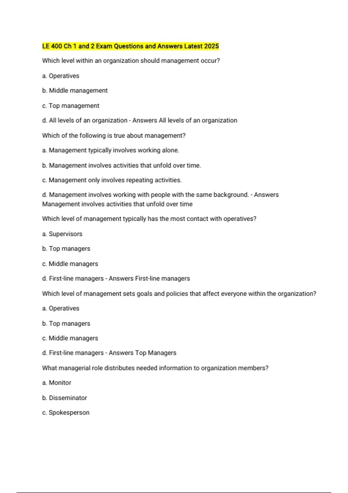 LE 400 Ch 1 and 2 Exam Questions and Answers Latest 2025 Which level within an organization should management occur? a. Operatives b. Middle management c. Top management d. All levels of an organization - Answers All levels of an organization Which of the following is true about management? a. Management typically involves working alone. b. Management involves activities that unfold over time. c. Management only involves repeating activities. d. Management involves working with people with the same background. - Answers Management involves activities that unfold over time Which level of management typically has the most contact with operatives? a. Supervisors b. Top managers c. Middle managers d. First-line managers - Answers First-line managers Which level of management sets goals and policies that affect everyone within the organization? a. Operatives b. Top managers c. Middle managers d. First-line managers - Answers Top Managers What managerial role distributes needed information to organization members? a. Monitor b. Disseminator c. Spokesperson d. Resource allocator - Answers Disseminator Which heading does the "leader" managerial role fall? a. Decisional b. Intrapersonal c. Interpersonal d. Informational - Answers Interpersonal Which heading does the "negotiator" managerial role fall? a. Decisional b. Intrapersonal c. Interpersonal d. Informational - Answers decisional What happens when a manager gets the knack of doing something that doesn't come naturally? a. It encourages others to do the same. b. It empowers people to work for him or her. c. It helps the manager develop management skills. d. It encourages managers to do the work themselves. - Answers It empowers people to work for him or her Which of the following is a manager's responsibility in a cadet unit? a. Making sure everyone has water. b. Making sure everyone is getting good grades. c. Making sure everyone is attending all their classes. d. Making sure that learning is always taking place. - Answers Making sure that learning is always taking place How can you help a cadet that has shared confidential information with you? a. Lie to others b. Ask the instructor to help the cadet c. Say only what you need to say without saying too much d. Break the cadets confidence and tell others the situation - Answers Say only what you need to say without saying too much What is at the very heart of management? a. Organizational skills