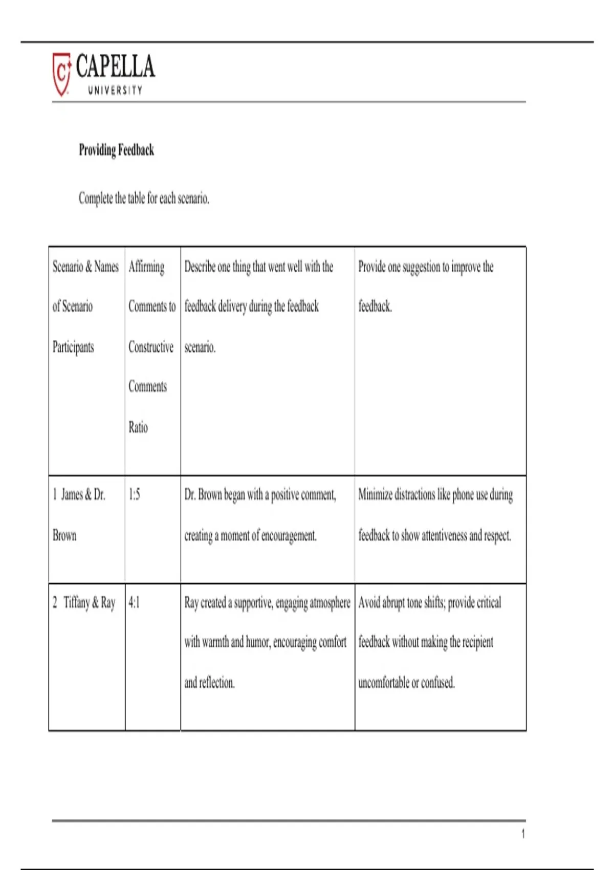 This document is a feedback template designed for use in a professional or academic setting, likely related to Applied Behavior Analysis (ABA) or social work, specifically concerning the methodology and delivery of constructive feedback. Document Description The file provides a structured template used to document and evaluate feedback sessions based on hypothetical scenarios. It focuses on the balance, quality, and effectiveness of the feedback provided. Key Sections and Concepts: Feedback Scenarios: A table lists several scenarios involving pairs of individuals (e.g., James & Dr. Brown, Tiffany & Ray) engaging in a feedback exchange. Affirming-to-Constructive Ratio: The template tracks the ratio of positive (Affirming) comments to areas needing improvement (Constructive comments), which is a core concept in effective feedback delivery, often aiming for a high ratio (e.g., 4:1). Evaluation Criteria: For each scenario, the document requires the user to: Describe one thing that went well (e.g., "began with a positive comment"). Provide one suggestion to improve the feedback delivery (e.g., "Minimize distractions like phone use"). Professional Principles: The surrounding text references principles and ethical codes that guide the feedback process, including ABA principles and the Capella Compassion Code, emphasizing the need for feedback to build competence, confidence, and ethical practice.