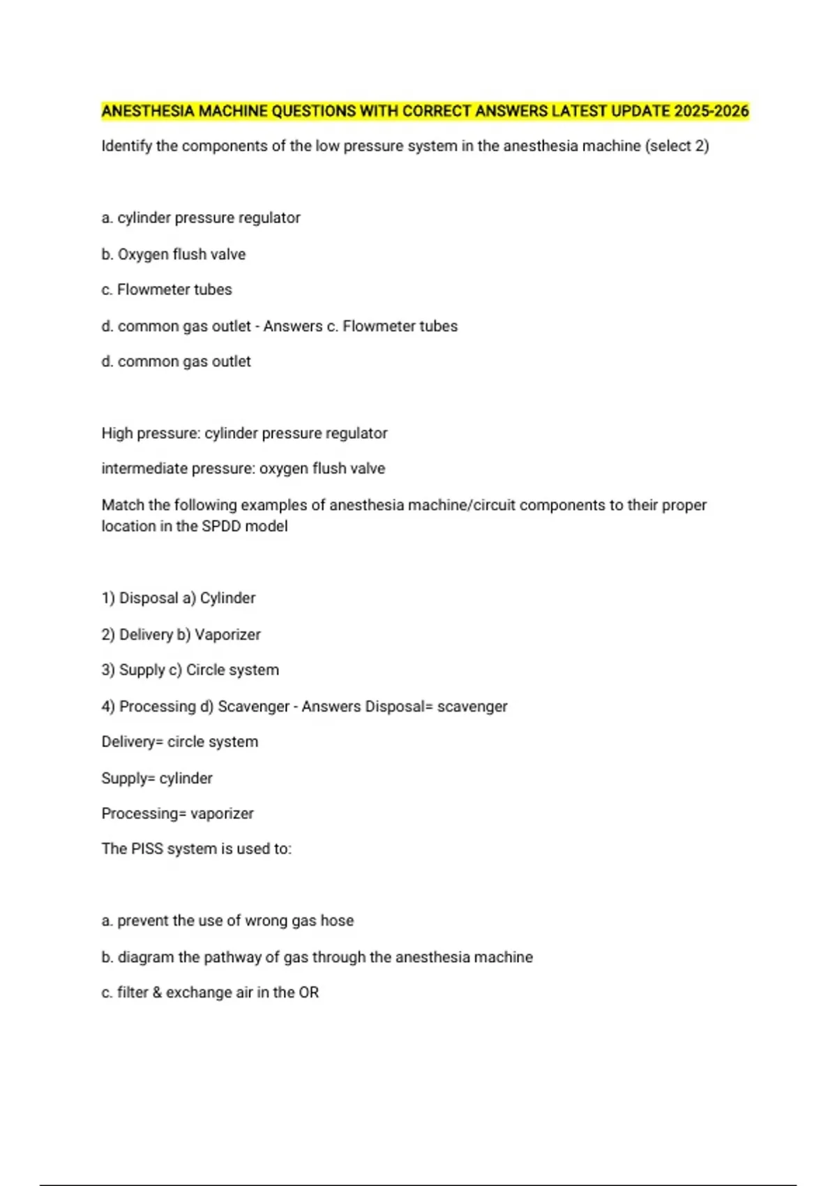 ANESTHESIA MACHINE QUESTIONS WITH CORRECT ANSWERS LATEST UPDATE Identify the components of the low pressure system in the anesthesia machine (select 2) a. cylinder pressure regulator b. Oxygen flush valve c. Flowmeter tubes d. common gas outlet - Answers c. Flowmeter tubes d. common gas outlet High pressure: cylinder pressure regulator intermediate pressure: oxygen flush valve Match the following examples of anesthesia machine/circuit components to their proper location in the SPDD model 1) Disposal a) Cylinder 2) Delivery b) Vaporizer 3) Supply c) Circle system 4) Processing d) Scavenger - Answers Disposal= scavenger Delivery= circle system Supply= cylinder Processing= vaporizer The PISS system is used to: a. prevent the use of wrong gas hose b. diagram the pathway of gas through the anesthesia machine c. filter & exchange air in the OR d. prevent the use of the wrong gas cylinder - Answers d. prevent the use of the wrong gas cylinder The pin index safety system (PISS) prevents wrong cylinder from being attached to anesthesia machine. The diameter index safety system (DISS) prevents the wrong gas hose from being attached to the anesthesia machine SPDD model describes the pathway of gas through the anesthesia machine Filtering & exchanging air in the OR is not a function of the anesthesia machine The bourdon pressure gauge on an oxygen cylinder reads 500psi. If the flow rate is 2L/min, how long will this cylinder provider O2 o the patient. (enter minutes & round to nearest whole number) - Answers 83-87 (660L/1900psi)=conversion factor 500 x conversion factor / 2L per min= 86.4 min Identify the best practices for handling gas cylinders (select 2) a. removing the plastic over on the port when installing the cylinder b. placing 2 washers between the cylinder & the hanger yoke c. oiling cylinder valves every 6 months d. laying the cylinder on its side when changing the cylinder on the anesthesia machine - Answers a. removing the plastic over on the port when installing the cylinder d. laying the cylinder on its side when changing the cylinder on the anesthesia machine Under normal circumstances, gas cylinders must be stored in upright position and secured. When changing the cylinder on the anesthesia machine, it is appropriate to temporarily place the old cylinder on its side until it can be moved to its appropriate storage receptacle. you should remove the plastic over from the port before installing the cylinder. failure to do so may obstruct gas flow when the cylinder is turned on oiling the cylinder valve increases risk of fire by combining O2 & N2O with oil. If there is a leak after you install a cylinder, do not be tempted to place more than one washer b/t the cylinder & the hanger yoke assembly. This may bypass the PISS & allow the wrong