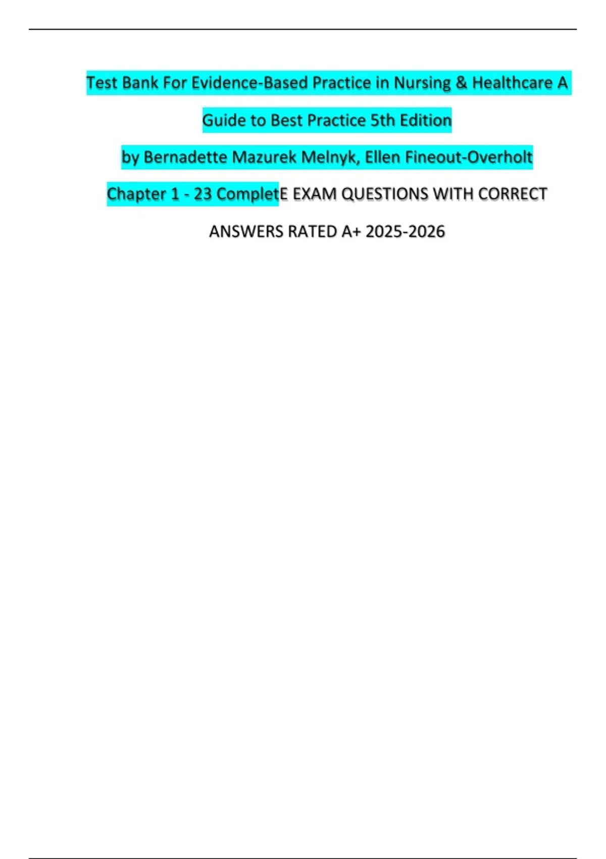 Test Bank For Evidence-Based Practice in Nursing & Healthcare A Guide to Best Practice 5th Edition by Bernadette Mazurek Melnyk, Ellen Fineout-Overholt Chapter 1 - 23 CompletE EXAM QUESTIONS WITH CORRECT ANSWERS RATED A+ INSTANT DOWNLOAD PDF – This exam-oriented question set covers chapters 1 through 23 from Evidence-Based Practice in Nursing & Healthcare (5th Edition) by Melnyk. It includes detailed questions designed to reinforce critical concepts such as research utilization, clinical decision-making, appraisal of evidence, and implementation science. Perfect for nursing students and professionals preparing for assessments in evidence-based practice and healthcare research. evidence-based nursing, Melnyk 5th edition, nursing research questions, EBP exam prep, nursing decision-making, healthcare research quiz, clinical practice questions, nursing theory and evidence, research utilization, chapter-based nursing questions, nursing school study aid, nursing quiz bank, evidence appraisal nursing, nursing knowledge translation