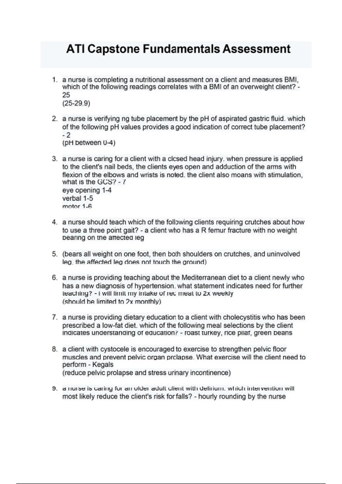 1. a nurse is completing a nutritional assessment on a client and measures BMI, which of the following readings correlates with a BMI of an overweight client? - 25 (25-29.9) 2. a nurse is verifying ng tube placement by the pH of aspirated gastric fluid. which of the following pH values provides a good indication of correct tube placement? - 2 (pH between 0-4) 3. a nurse is caring for a client with a closed head injury. when pressure is applied to the client's nail beds, the clients eyes open and adduction of the arms with flexion of the elbows and wrists is noted. the client also moans with stimulation, what is the GCS? - 7 eye opening 1-4 verbal 1-5 motor 1-6 4. a nurse should teach which of the following clients requiring crutches about how to use a three point gait? - a client who has a R femur fracture with no weight bearing on the affected leg 5. (bears all weight on one foot, then both shoulders on crutches, and uninvolved leg, the affected leg does not touch the ground) 6. a nurse is providing teaching about the Mediterranean diet to a client newly who has a new diagnosis of hypertension. what statement indicates need for further teaching? - i will limit my intake of red meat to 2x weekly (should be limited to 2x monthly) 7. a nurse is providing dietary education to a client with cholecystitis who has been prescribed a low-fat diet. which of the following meal selections by the client indicates understanding of education? - roast turkey, rice pilaf, green beans 8. a client with cystocele is encouraged to exercise to strengthen pelvic floor muscles and prevent pelvic organ prolapse. What exercise will the client need to perform - Kegals (reduce pelvic prolapse and stress urinary incontinence) 9. a nurse is caring for an older adult client with delirium. which intervention will most likely reduce the client's risk for falls? - hourly rounding by the nurse ATI Capstone Fundamentals Assessment 10. a nurse is caring for a client who has been prescribed furosemide. which of the following foods should the nurse encourage this to include in his diet? - oranges