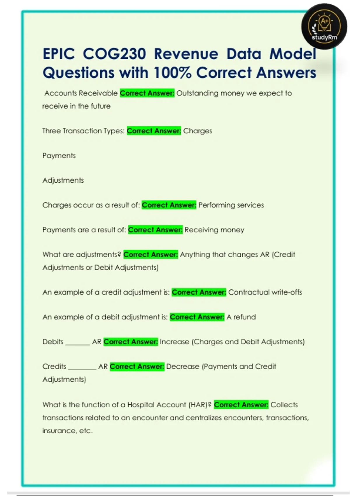 Debits _______ AR Correct Answer: Increase (Charges and Debit Adjustments)