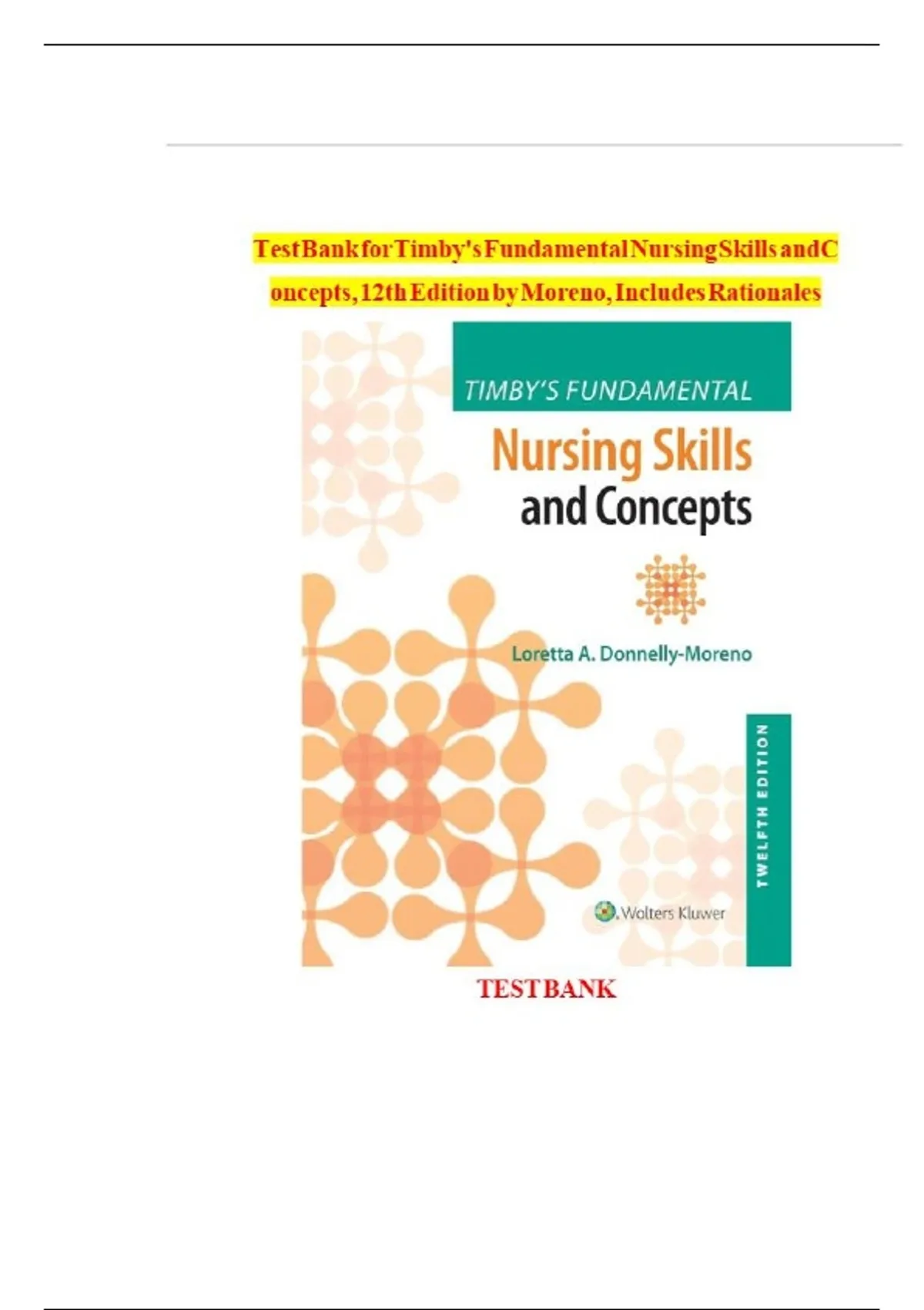 TEST BANK FOR TIMBY'S FUNDAMENTAL NURSING SKILLS AND CONCEPTS 12TH EDITION BY MORENO TIMBY.ISBN:9781975141776 COMPLETE GUIDE All CHAPTERS COVERED 100% VERIFIED A+ GRADE ASSURED!!!!! NEW LATEST UPDATE!!!!!