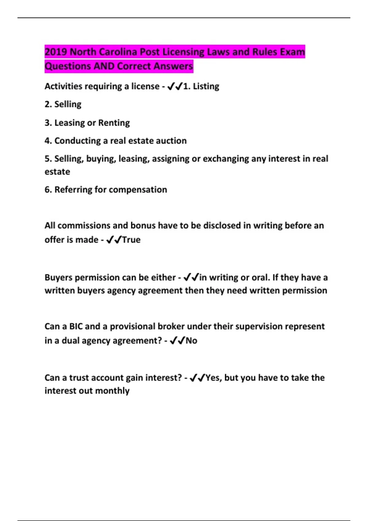 2019 North Carolina Post Licensing Laws and Rules Exam