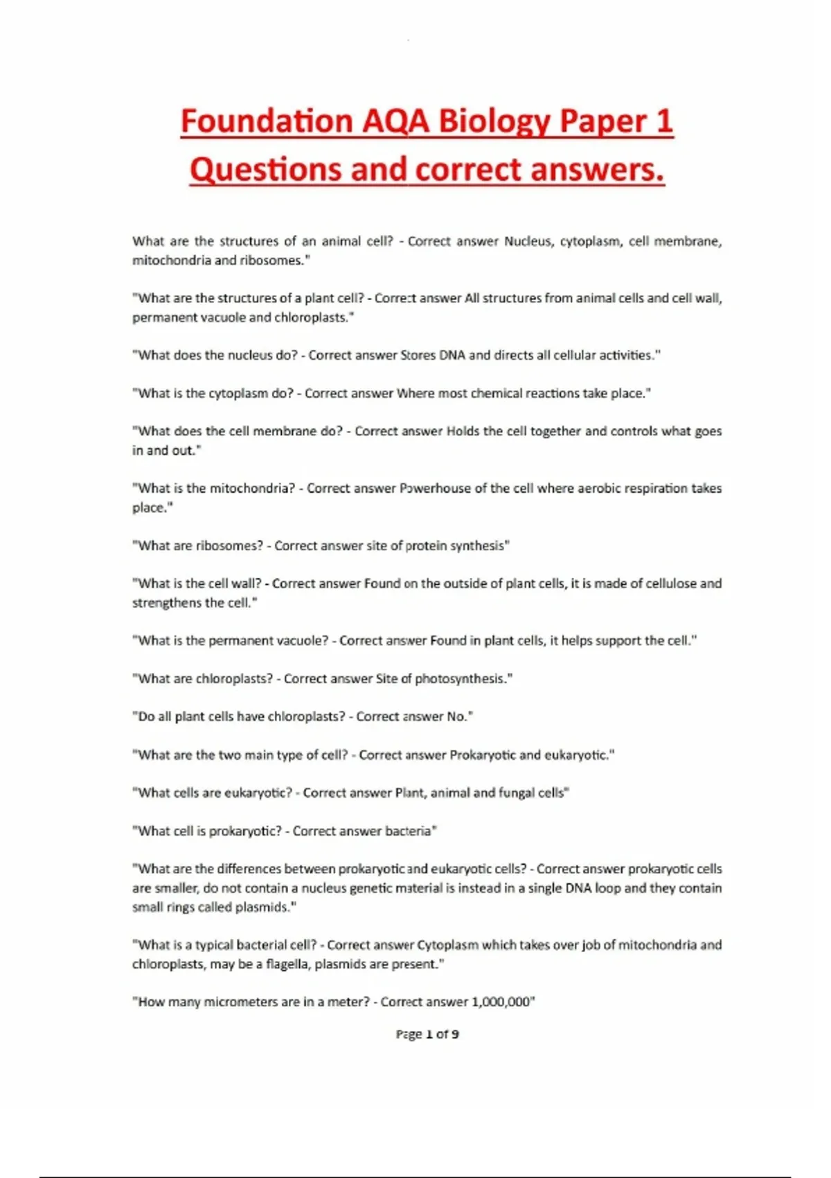 Foundation AQA Biology Paper 1 Questions and correct answers.Foundation AQA Biology Paper 1 Questions and correct answers.