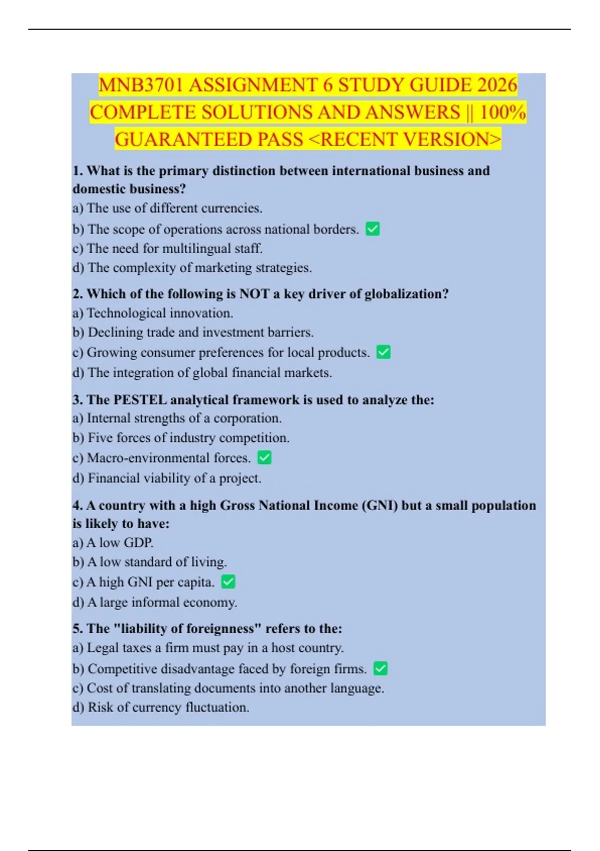 MNB3701 ASSIGNMENT 6 STUDY GUIDE 2026 COMPLETE SOLUTIONS AND ANSWERS || 100% GUARANTEED PASS &lt;RECENT VERSION&gt;