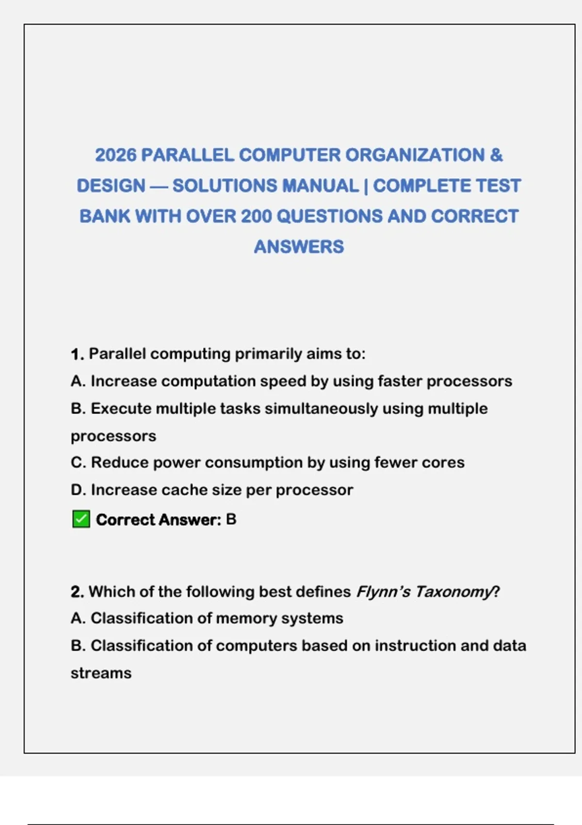 2026 PARALLEL COMPUTER ORGANIZATION & DESIGN — SOLUTIONS MANUAL | COMPLETE TEST BANK WITH OVER 200 QUESTIONS AND CORRECT ANSWERS