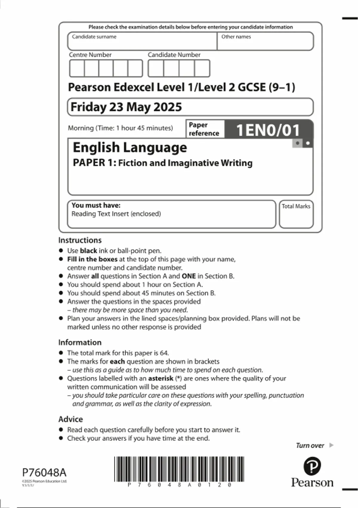 PEARSON EDEXCEL GCSE ENGLISH LANGUAGE PAPER 1 QUESTION PAPER 2025 (1EN0/01: Fiction and Imaginative Writing)