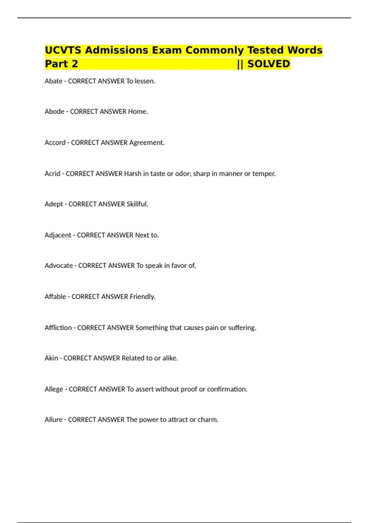 Abate - CORRECT ANSWER To lessen. Abode - CORRECT ANSWER Home. Accord - CORRECT ANSWER Agreement. Acrid - CORRECT ANSWER Harsh in taste or odor; sharp in manner or temper. Adept - CORRECT ANSWER Skillful. Adjacent - CORRECT ANSWER Next to. Advocate - CORRECT ANSWER To speak in favor of. Affable - CORRECT ANSWER Friendly. Affliction - CORRECT ANSWER Something that causes pain or suffering. Akin - CORRECT ANSWER Related to or alike. Allege - CORRECT ANSWER To assert without proof or confirmation. Allure - CORRECT ANSWER The power to attract or charm. Ambiguous - CORRECT ANSWER Unclear or doubtful in meaning. Amiss - CORRECT ANSWER In a wrong or imperfect way. Anarchy - CORRECT ANSWER (n) A lack of government and law; confusion. Apathetic - CORRECT ANSWER Feeling or showing little emotion. Apex - CORRECT ANSWER The highest point of something. Articulate - CORRECT ANSWER (v.) To pronounce distinctly; to express well in words; to fit together into a system; (adj.) able to use language effectively; expressed clearly and forcefully. Aspire - CORRECT ANSWER (v.) To have ambitious hopes or plans, strive toward a higher goal, desire earnestly; to ascend. Assimilate - CORRECT ANSWER (v.) To absorb fully or make one's own; to adopt as one's own; to adapt fully. Astute - CORRECT ANSWER (adj.) Shrewd, crafty, showing practical wisdom. Atrocity - CORRECT ANSWER (n.) An extremely wicked, brutal, or cruel act; something very bad or unpleasant. Audacious - CORRECT ANSWER (adj.) Bold, adventurous, recklessly daring. Augment - CORRECT ANSWER To make larger, increase. Avert - CORRECT ANSWER (v.) To turn aside, turn away; to prevent, avoid. Avid - CORRECT ANSWER Desirous of something to the point of greed; intensely eager. Awry - CORRECT ANSWER (adj., adv.) In a turned or twisted position or direction; wrong, out of the right or hoped-for course. Banter - CORRECT ANSWER (v.) To exchange playful remarks, tease; (n.) talk that is playful and teasing. Barter - CORRECT ANSWER (n.) An exchange in trade; (v.) to exchange goods. Benefactor - CORRECT ANSWER A person who gives friendly aid. Benighted - CORRECT ANSWER Being in a state of intellectual darkness; ignorant; unenlightened. Bigot - CORRECT ANSWER (n.) An intolerant, prejudiced, or biased person. Bizarre - CORRECT ANSWER (adj.) Extremely strange, unusual, atypical. Blatant - CORRECT ANSWER Obvious. Bleak - CORRECT ANSWER (adj.) Bare, dreary, dismal. Cache - CORRECT ANSWER (n.) A hiding place; something hidden or stored. Candid - CORRECT ANSWER (adj.) Frank, sincere; impartial; unposed. Capacious - CORRECT ANSWER (adj.) Able to hold much, roomy. Capricious - CORRECT ANSWER Given to sudden and unaccountable changes of mood or behavior. Capsize - CORRECT ANSWER To overturn. Cascade - CORRECT ANSWER Waterfall. Chaff - CORRECT ANSWER Husks of grain separated from the seed by threshing. Chastise - CORRECT ANSWER (v.) To inflict physical punishment as a means of correction; to scold severely. Citadel - CORRECT ANSWER (n.) A fortress that overlooks and protects a city; any strong or commanding place. Clad - CORRECT ANSWER Clothed or covered. Clarify - CORRECT ANSWER To make clear. Cogent - CORRECT ANSWER Forceful, convincing; relevant, to the point. Cogitate - CORRECT ANSWER To think deeply. Cognizant - CORRECT ANSWER (adj.) Aware, knowledgeable, informed; having jurisdiction. Component - CORRECT ANSWER A part or element of a larger whole. Confiscate - CORRECT ANSWER To seize, by force if necessary; to take possession of. Connoisseur - CORRECT ANSWER (n.) An expert; one who is well qualified to pass critical judgments, especially in one of the fine arts. Copious - CORRECT ANSWER (adj.) Abundant; plentiful; wordy, verbose. Counterfeit - CORRECT ANSWER Fake; false. Covet - CORRECT ANSWER To desire something belonging to another.