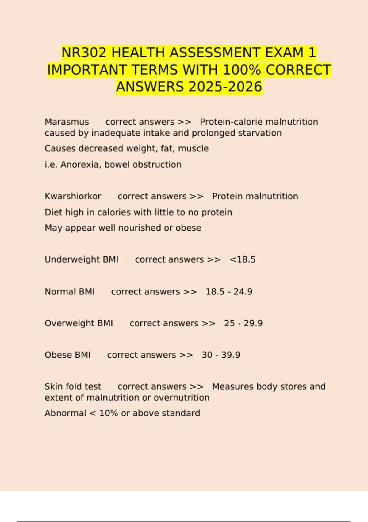 NR302 HEALTH ASSESSMENT EXAM 1 IMPORTANT TERMS WITH 100% CORRECT ANSWERS