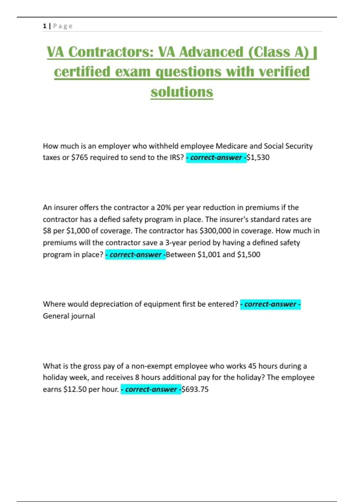 VA Contractors: VA Advanced (Class A) | certified exam questions with verified solutions