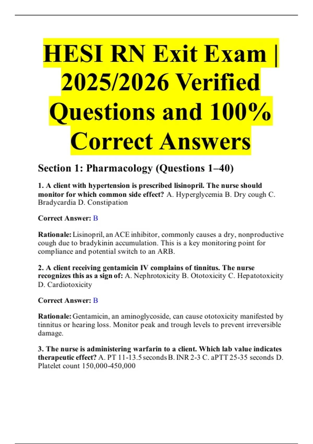 1. A client with hypertension is prescribed lisinopril. The nurse should