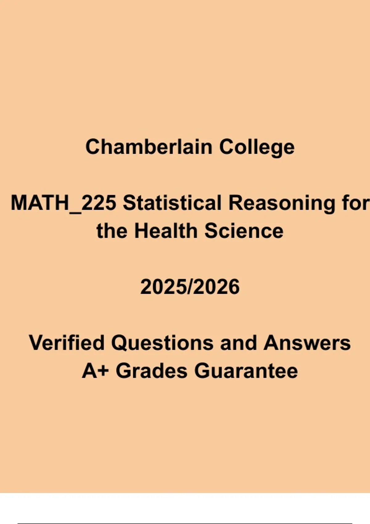 Master MATH 225 – Statistical Reasoning for the Health Sciences with this expert-verified 2025/2026 Study Guide, created specifically for Chamberlain College of Nursing students. This comprehensive resource includes accurate exam questions, detailed answers, and step-by-step explanations of key statistical concepts, probability, data interpretation, and hypothesis testing—all within a healthcare context. Ideal for assignments, quizzes, and final exam prep, this MATH 225 Statistics Study Pack ensures you build confidence and achieve top scores in your nursing statistics course.