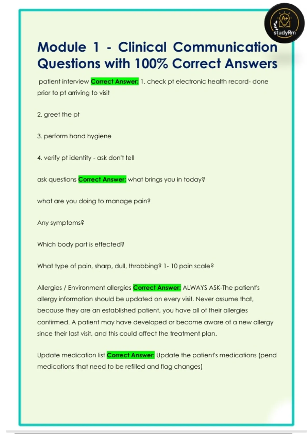Module 1 - Clinical Communication Questions with 100% Correct AnswerModule 1 - Clinical Communication Questions with 100% Correct Answer