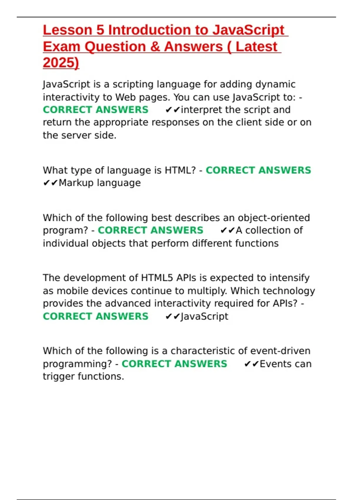Lesson 5 Introduction to JavaScript Exam Question & Answers ( Latest 2025).docx