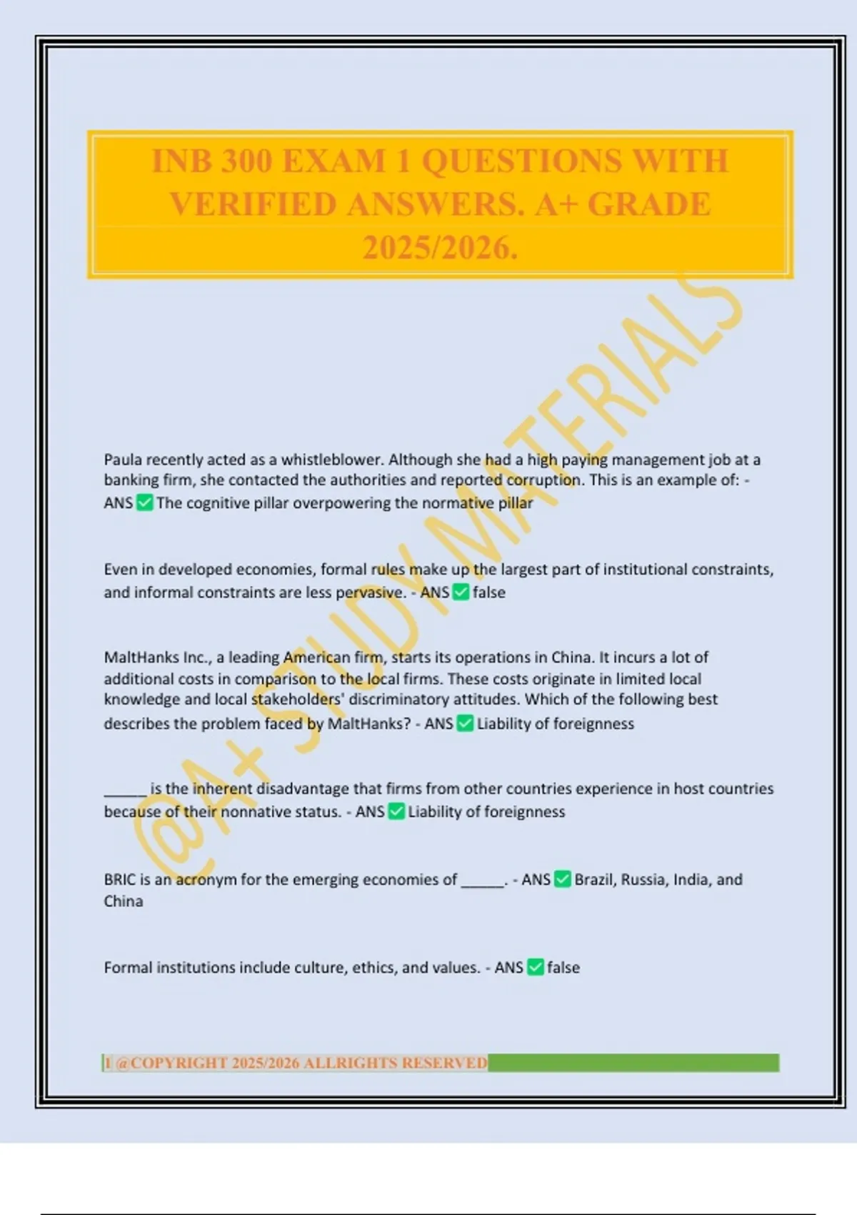 INB 300 EXAM 1 QUESTIONS WITH VERIFIED ANSWERS. A+ GRADE 2025/2026.