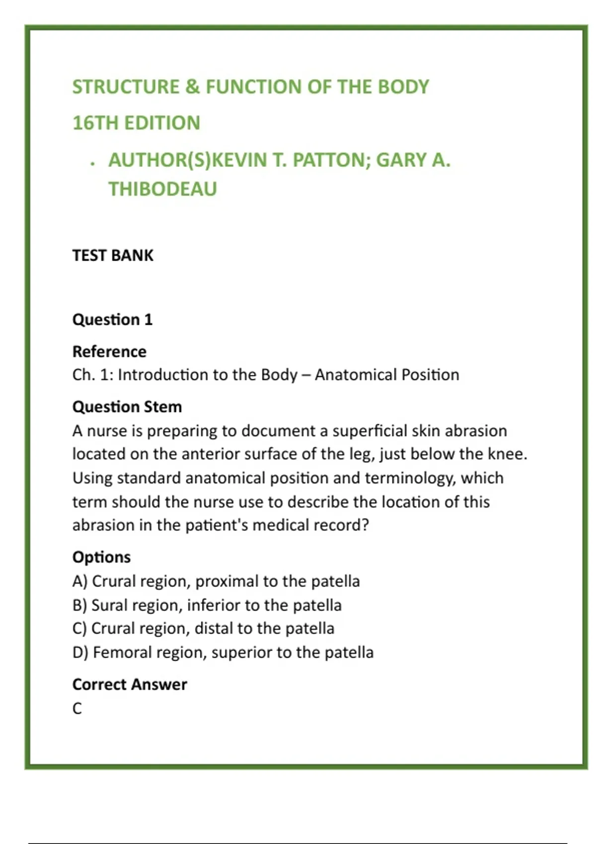 • Correct Answer C: The crural region is the anatomical term