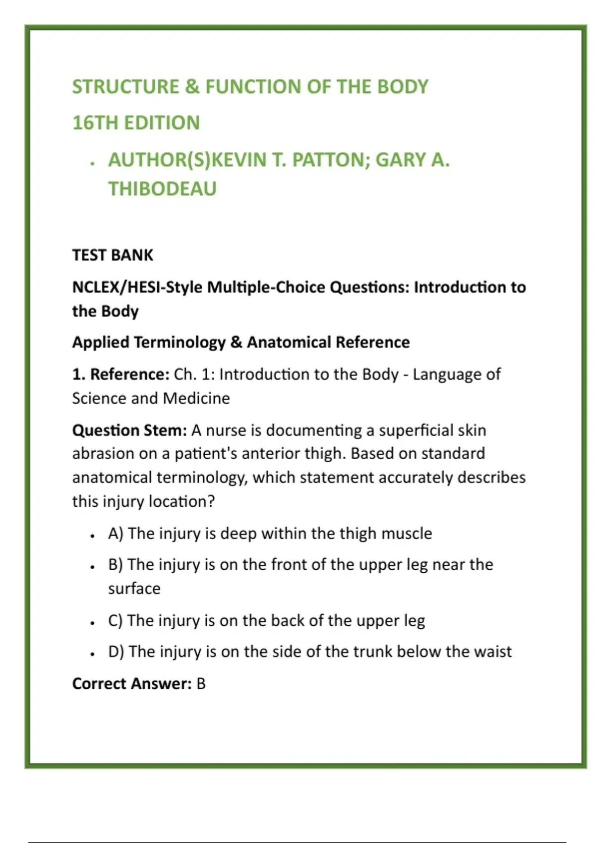 Anatomy & Physiology Test Bank for Structure & Function of the Body (16th Ed) - 20 NCLEX/HESI Questions per Chapter with Verified Rationales & Answer Keys Persuasive SEO Description Struggling to connect complex anatomical concepts with clinical nursing practice? Finding it challenging to master the intricate relationships between body systems for your NCLEX or HESI exams? This comprehensive test bank for Structure & Function of the Body, 16th Edition by Kevin T. Patton and Gary A. Thibodeau transforms how nursing and health science students approach A&P mastery . Developed specifically for today's competitive nursing and allied health programs, this digital resource provides 20 original NCLEX and HESI-style multiple-choice questions for every chapter, each featuring verified answers and detailed rationales reviewed by experienced A&P educators . Unlike generic question sets, our test bank strengthens your understanding through applied, evidence-based learning that bridges foundational anatomy with clinical nursing relevance . WHAT YOU RECEIVE: 20 NCLEX/HESI-style MCQs per chapter covering all body systems and foundational concepts Verified rationales explaining both correct and incorrect answers to reinforce learning Clinical application focus integrating structure-function relationships and homeostasis principles Comprehensive coverage aligned with current nursing, pre-nursing, and health science curricula KEY BENEFITS: Master complex body systems through applied questioning that emphasizes clinical connections Boost exam performance with question formats identical to those you'll encounter on NCLEX, HESI, and course exams Build strong foundations for advanced nursing courses by truly understanding A&P principles rather than memorizing Study efficiently with immediately available digital access after payment Ideal for nursing students, pre-nursing candidates, health science majors, and HESI/NCLEX candidates, this test bank addresses the specific challenges of mastering human anatomy and physiology for clinical application. The questions progress from foundational knowledge to higher-order thinking, ensuring you're prepared for both course exams and standardized tests . Start mastering Anatomy & Physiology today! Download instantly and take the first step toward A&P confidence and exam success. 10 High-Visibility Hashtags #AnatomyAndPhysiology #NursingStudents #APTestBank #PattonThibodeau #StructureAndFunctionOfTheBody #HESIReview #NCLEXPrep #HealthScience #NursingSchool #StudySmarter 20 SEO Keywords/Key Phrases Anatomy and Physiology Test Bank Structure and Function of the Body 16th Edition Patton and Thibodeau questions NCLEX A&P review Verified rationales Body systems practice quiz A&P chapter questions Nursing exam prep Health science test bank A&P practice questions Anatomy review for nurses Structure function study guide Human body systems test College A&P exam prep Physiology quiz bank Nursing foundations review HESI A&P practice Clinical A&P knowledge test Pre-nursing study material Anatomy physiology review questions