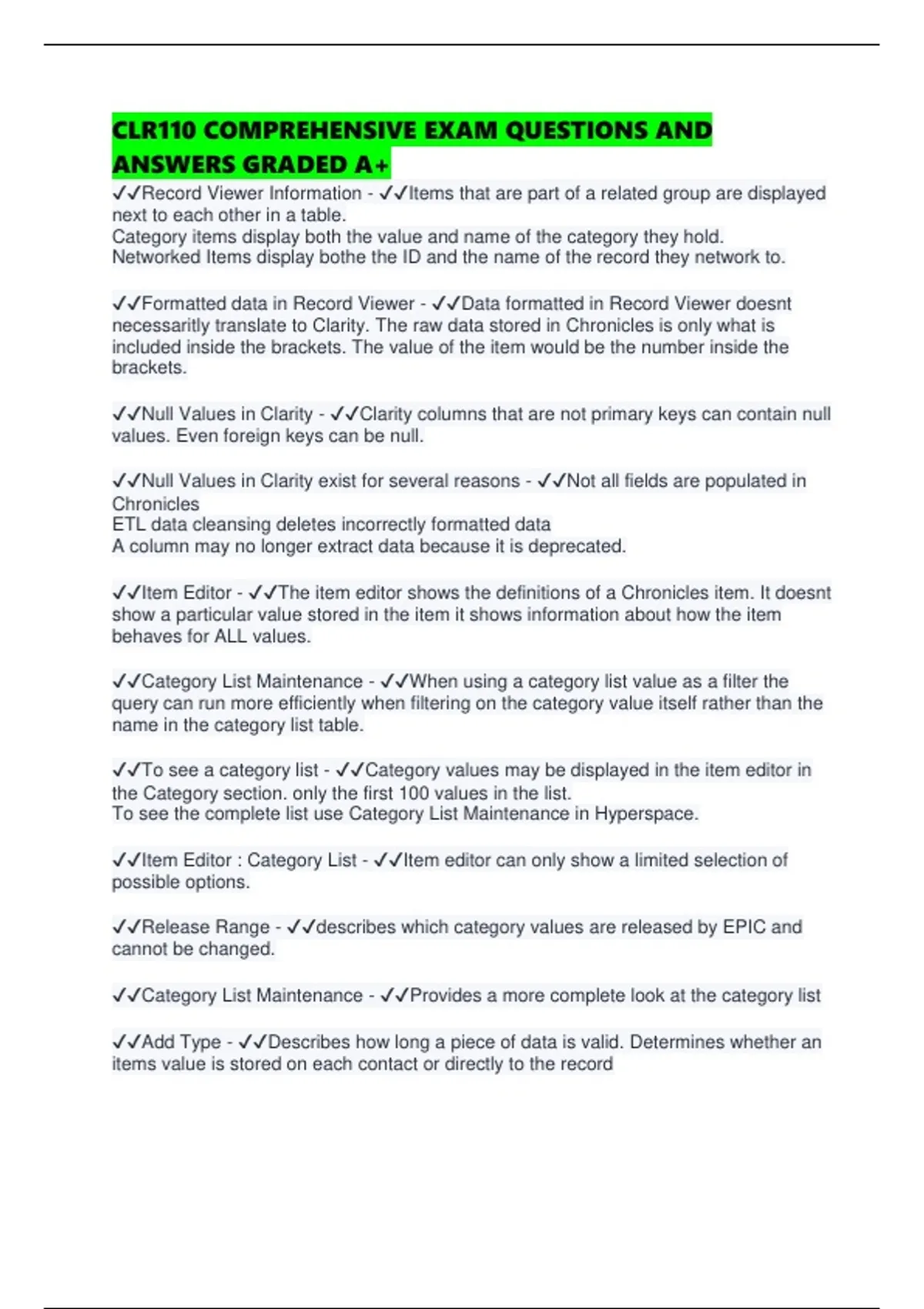 CLR110 COMPREHENSIVE EXAM QUESTIONS AND ANSWERS GRADED A+